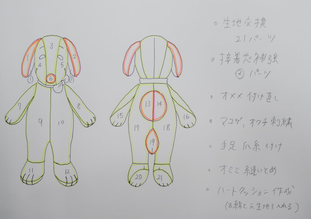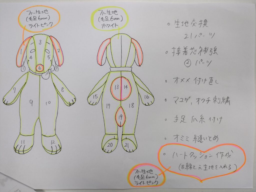 お顔・お体の白い部分は、診察時にご相談したファー生地(毛足6㎜)のホワイトが第一希望で、オフホワイトも検討されていましたがいかがでしょうか。