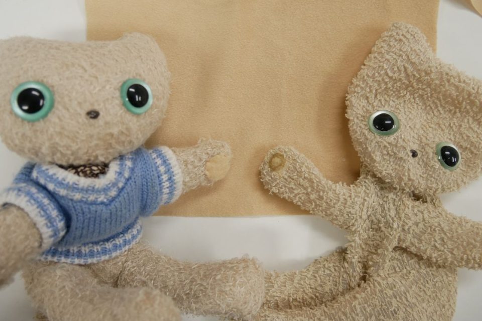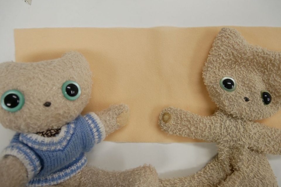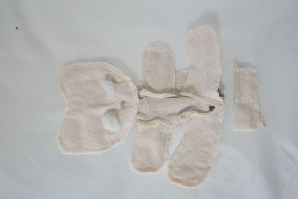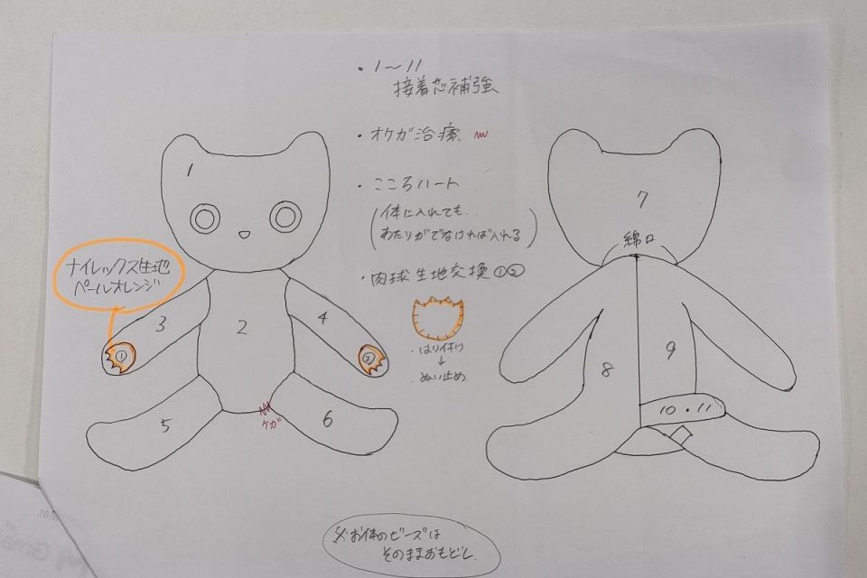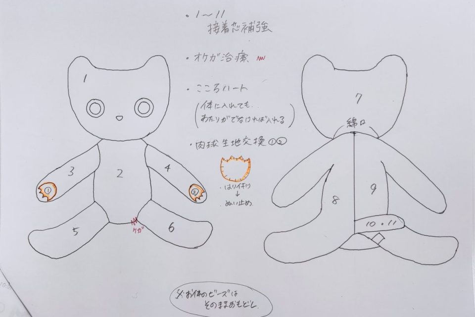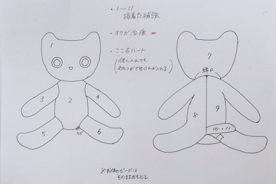 お送りいただきましたお写真と、インターネットでお仲間のぬいぐるみさんお調べしましたところ、元々は以下の図のような形だったかと思われますがいかがでしょうか。ご確認よろしくお願いいたします(*^^*)