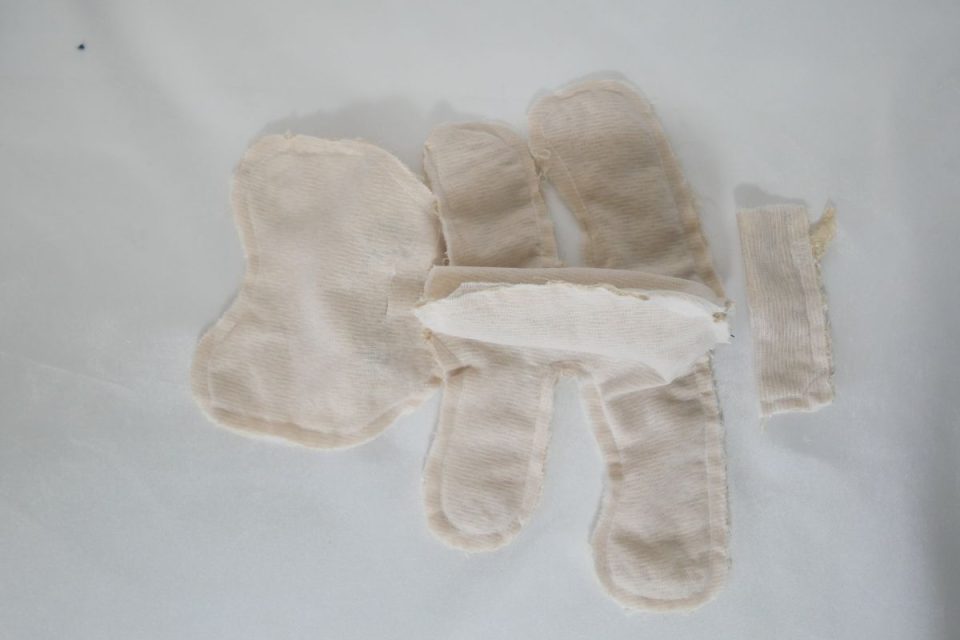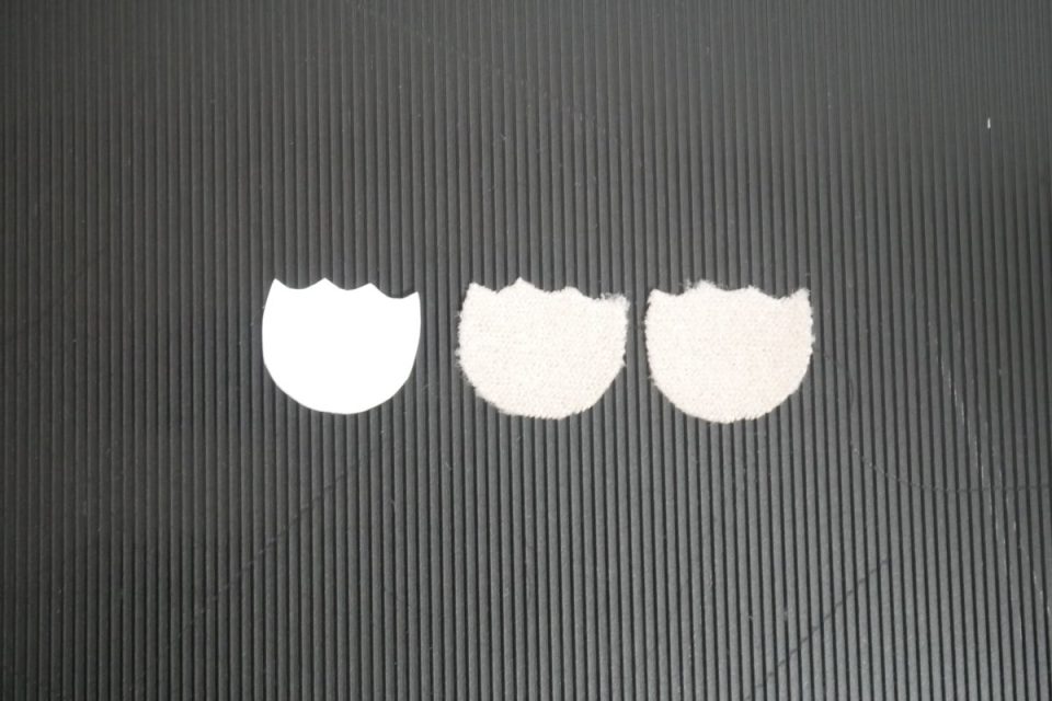 お返事ありがとうございます!上記型紙をもとに、肉球を裁断しました♪全身の接着芯補強治療も完了です♪