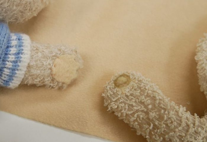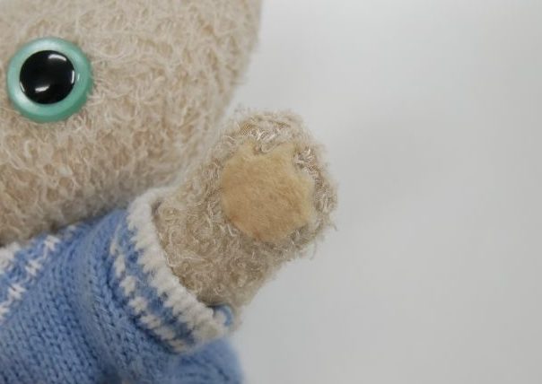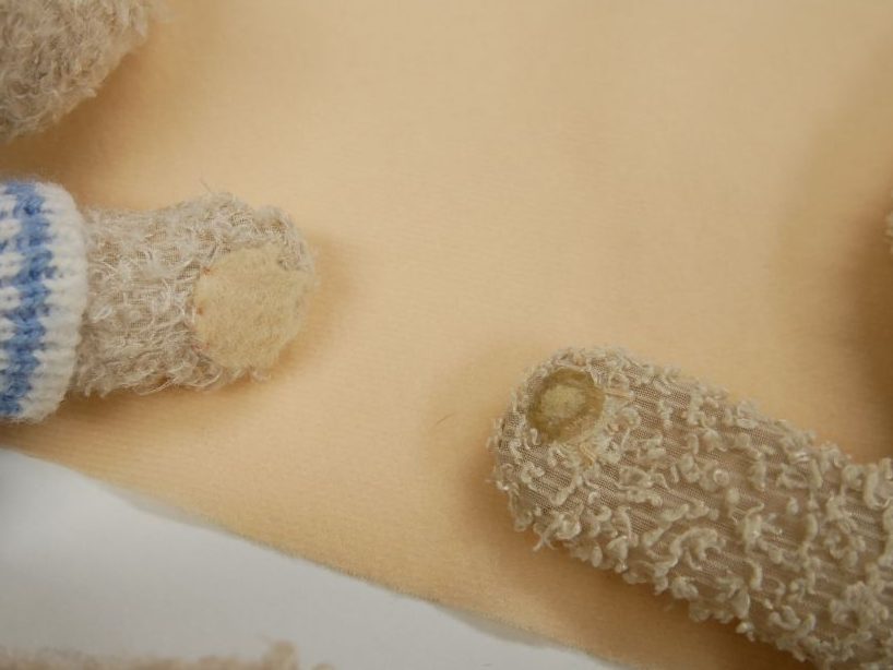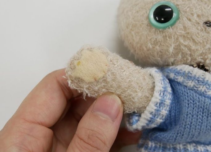 首の外れてしまっている部分は、オケガではなく綿をお入れするために手縫いで縫い閉じられている綿口が外れているだけでしたので、最後に手縫いでしっかりと縫い閉じますね(*^^*)v