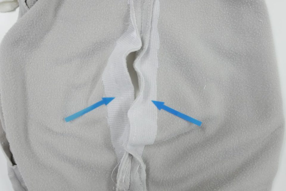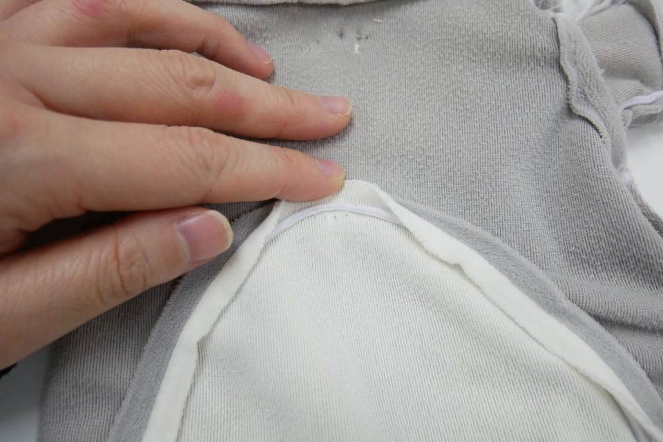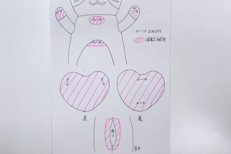 ここからオケガにつながるおそれがありますので、裏側から薄い芯をおはりし生地の補強をおこないましょう(^^)」!