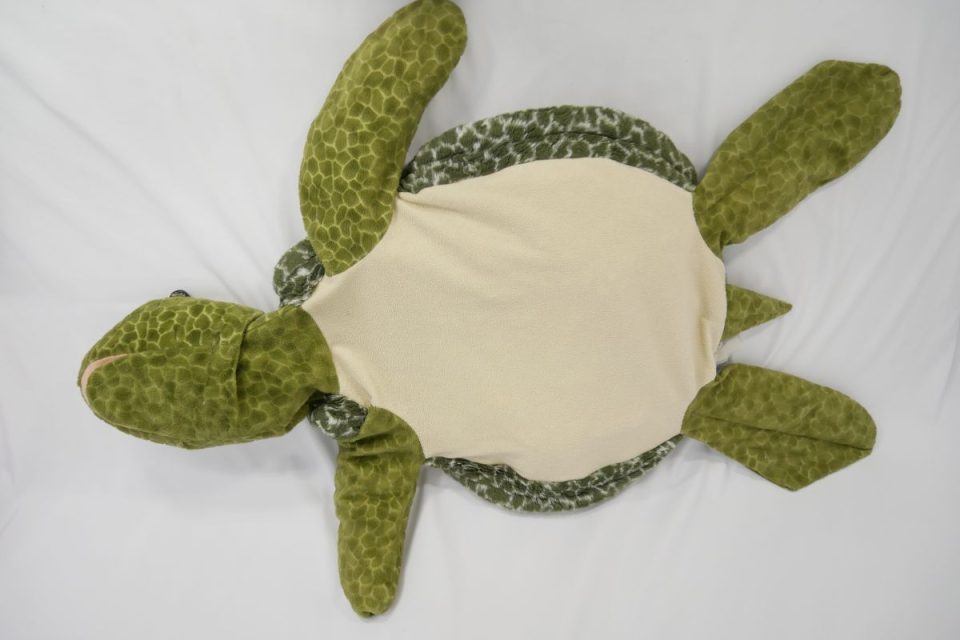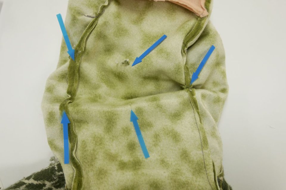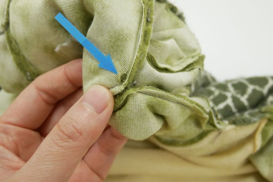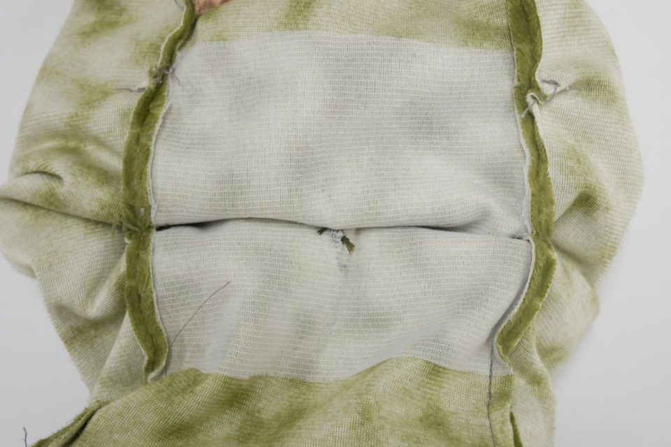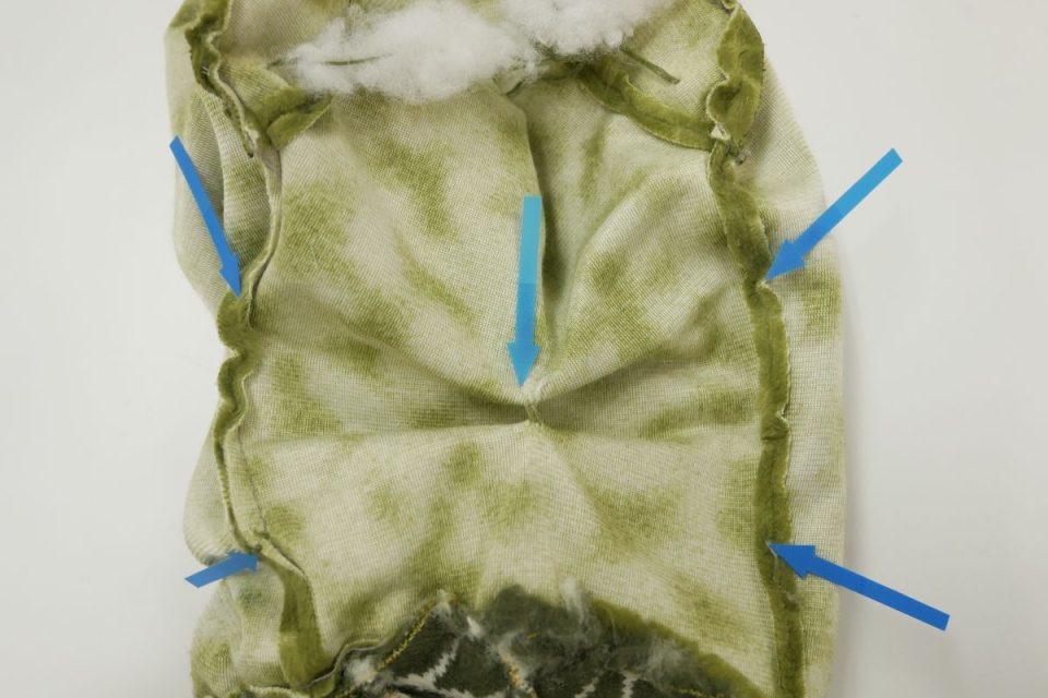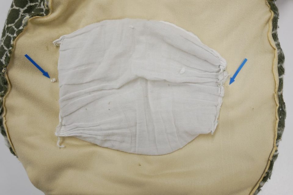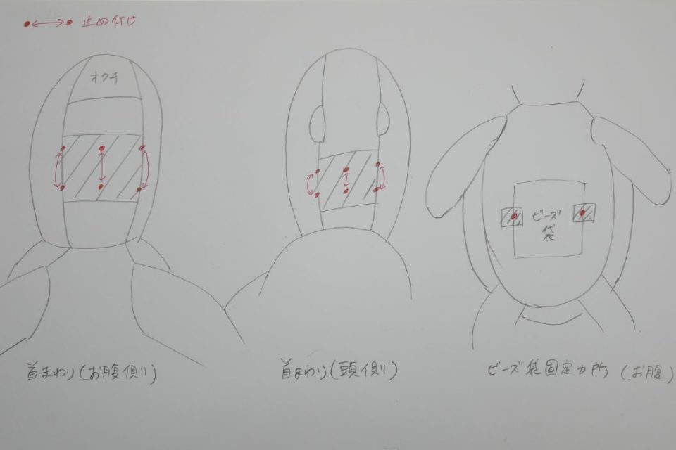 ビーズ袋はお腹の中で動かないように2点で固定されていた跡がありましたので、同じように固定しますね!
