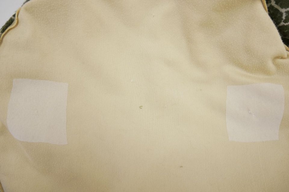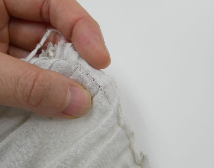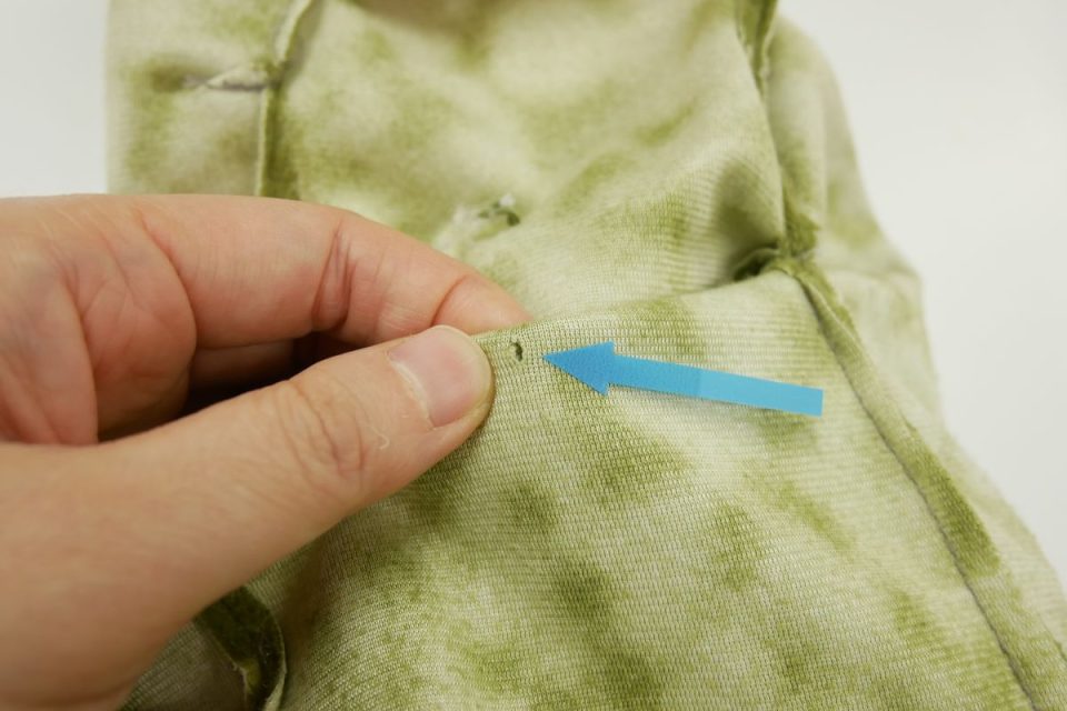 なお、とめ付けをおこなう箇所は力がかかりやすく、穴があいてしまっている箇所が数か所ありますので、穴をふさいだ後に接着芯で補強を行ってからとめ付け直します(^^)