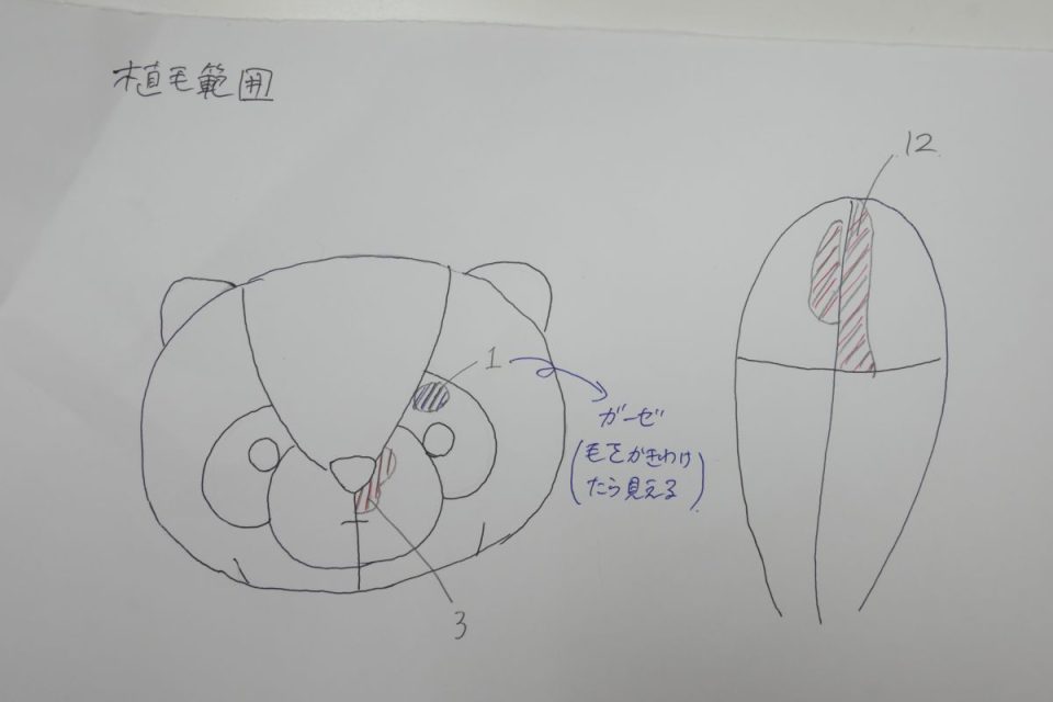 オメメの固定が完了しましたので、植毛範囲をご案内させていただきます!