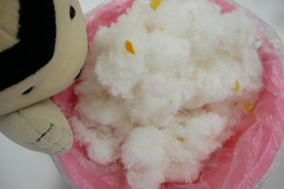 中綿は茶色いウレタン綿と白いポリエステル綿、チビダンくんは更に発泡スチロールが入っていました。