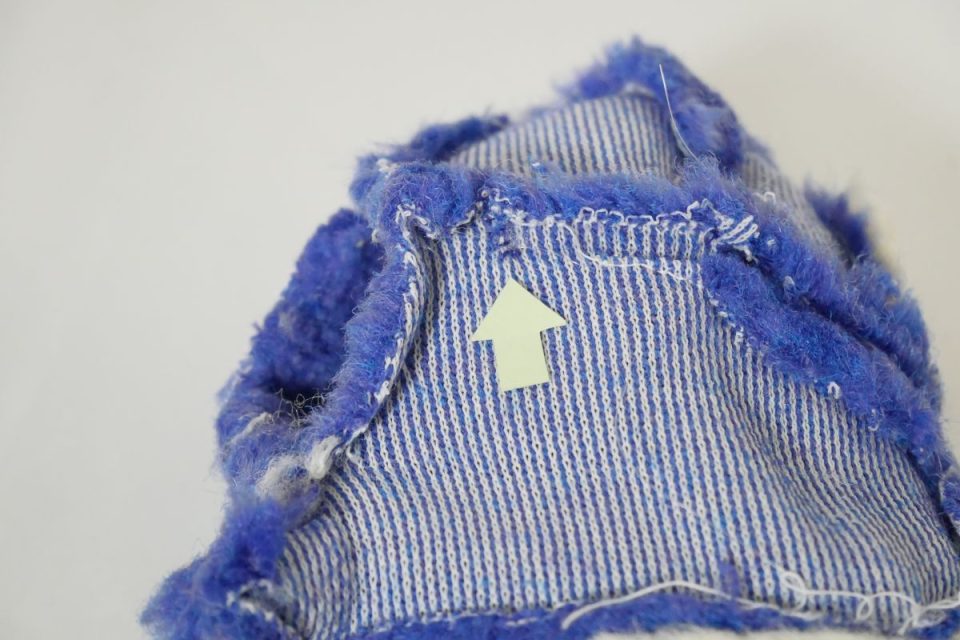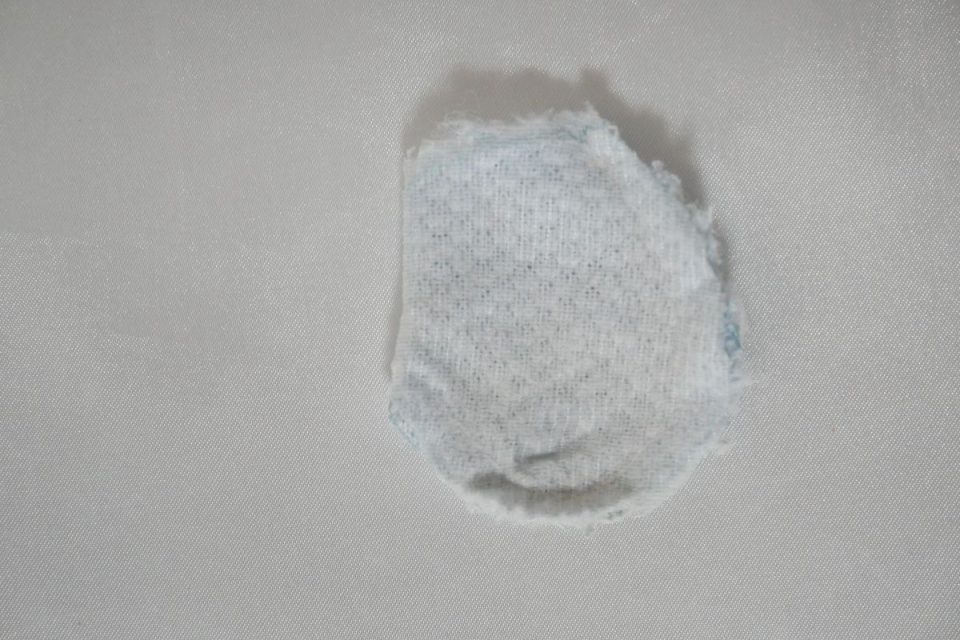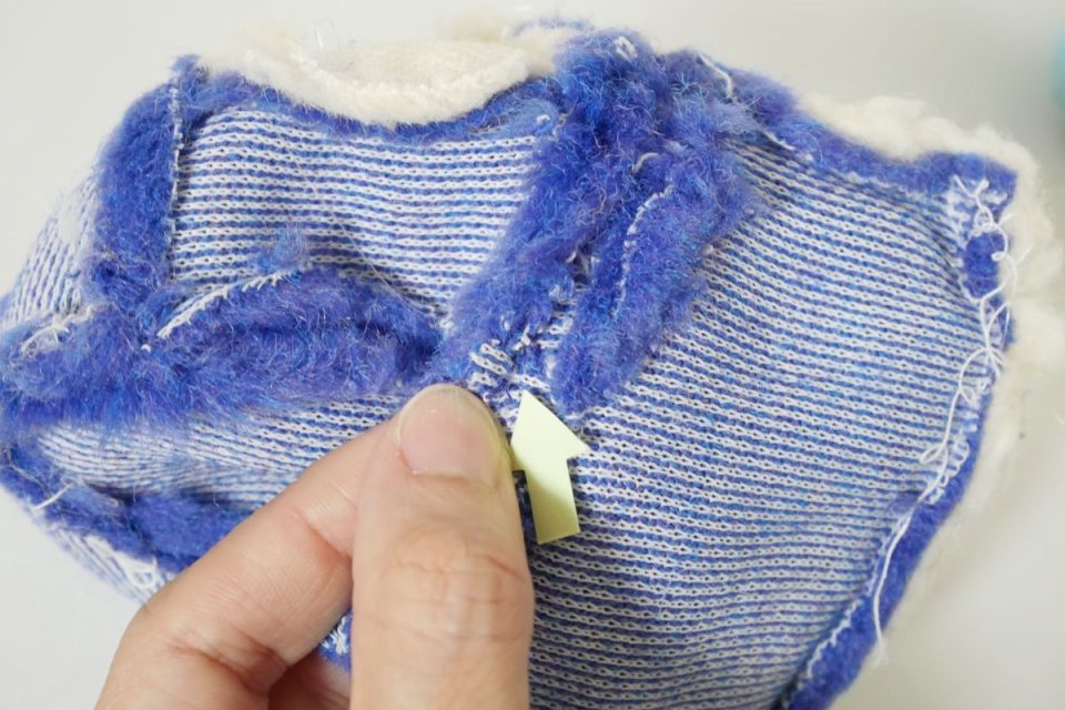 あおいクマさんのしっぽをほどき、裏面に接着芯補強、オケガの裏側にガーゼをあてての縫いふさぎ治療を行いました♪