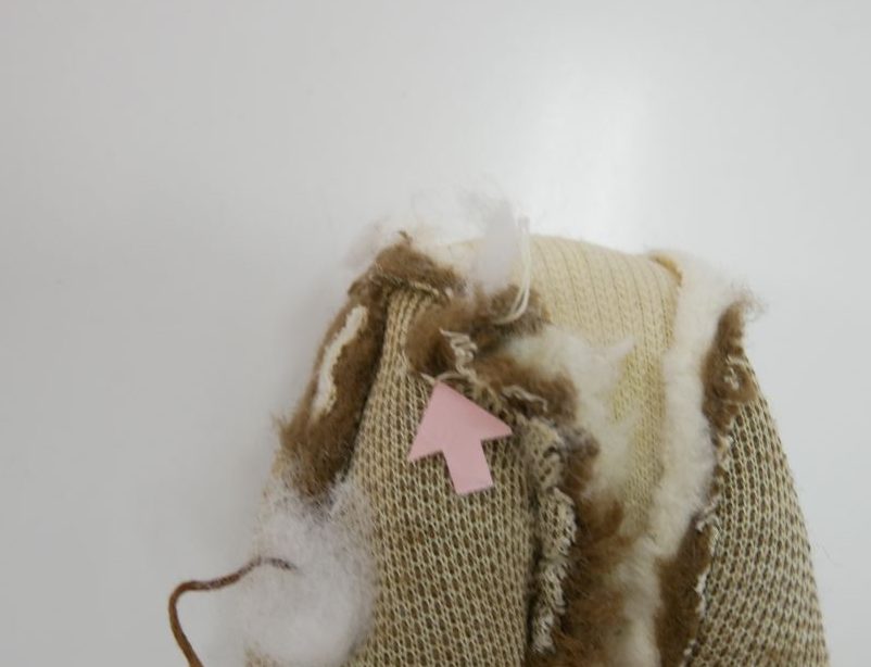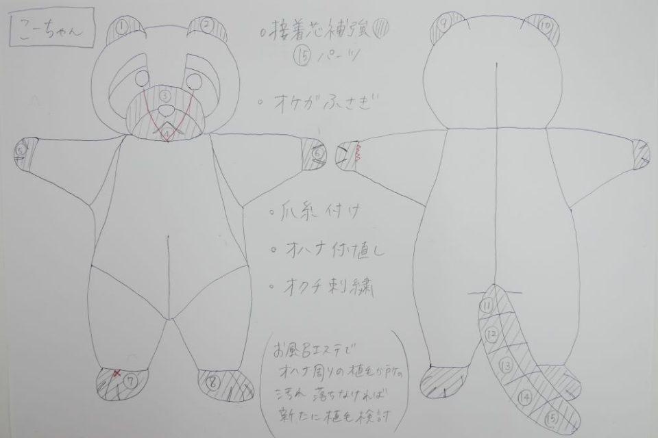 こーちゃんのオケガをふさぎ、オミミ・手足先・しっぽに接着芯を貼りました!
