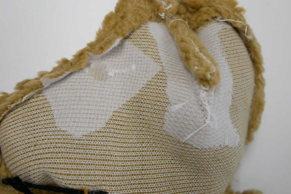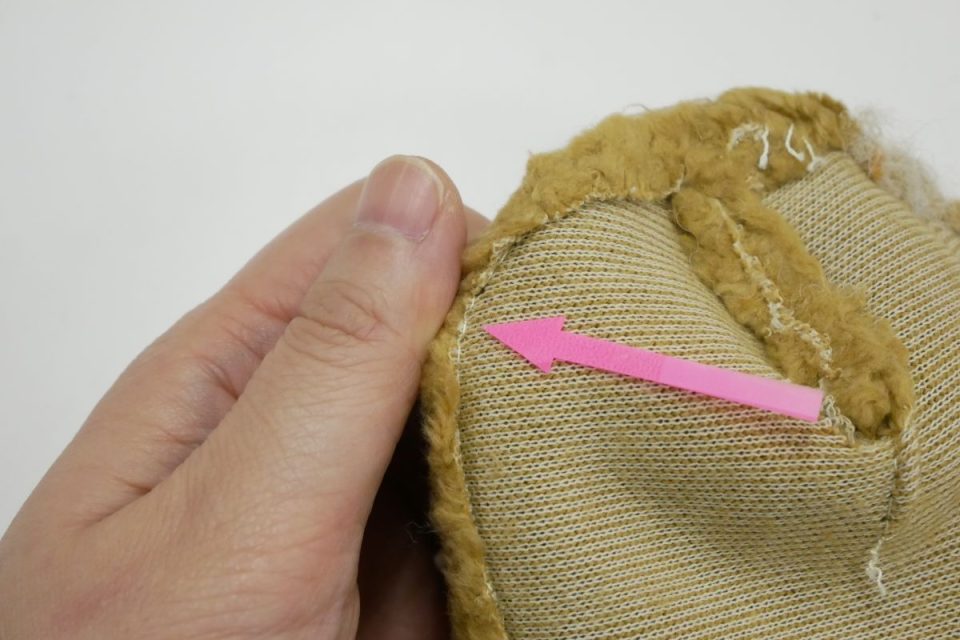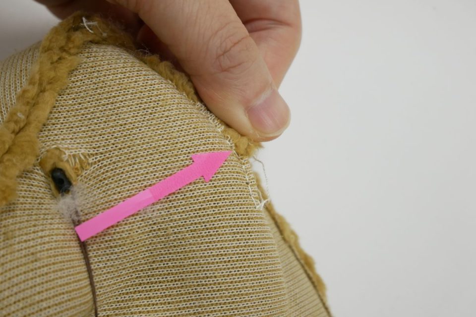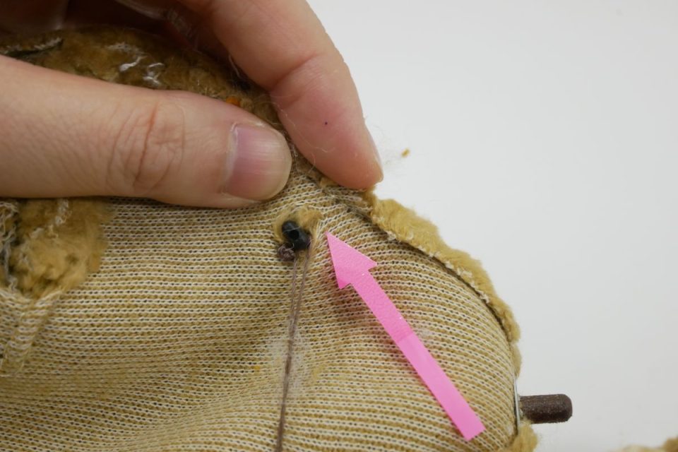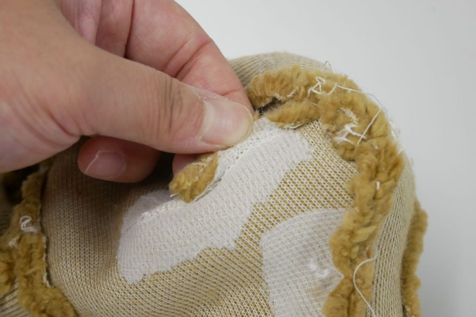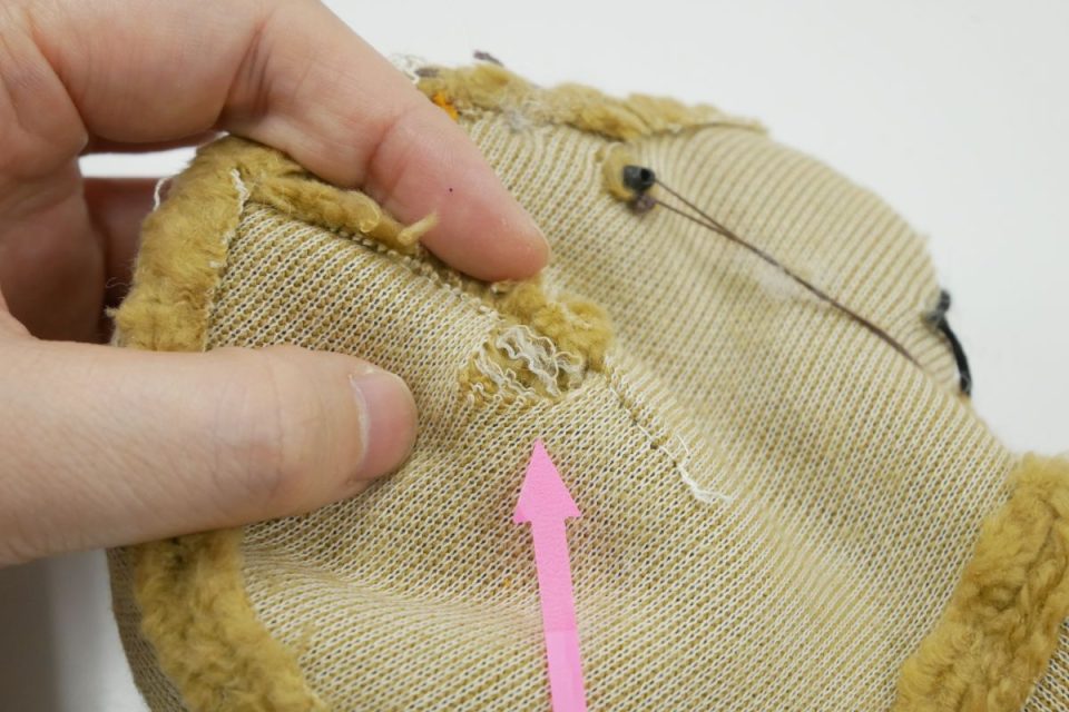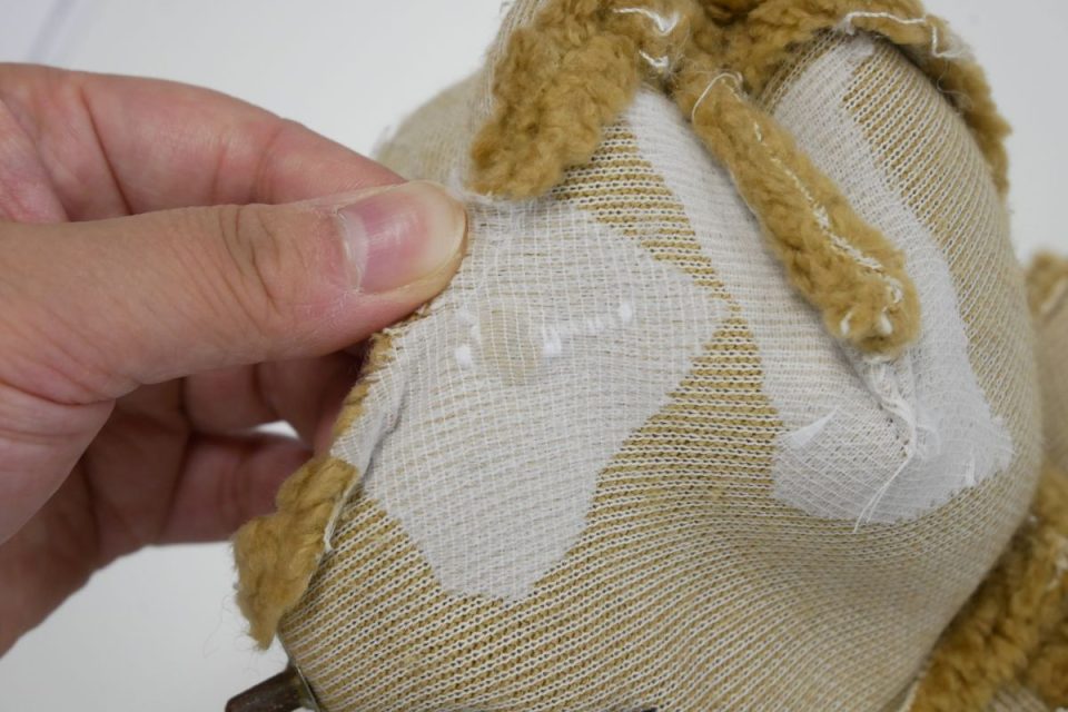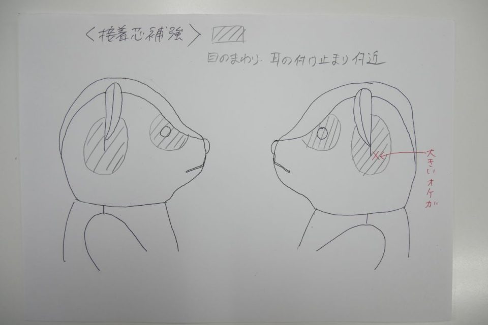 オミミの付け位置周辺・オメメ周りはチカラがかかりやすく、オケガも大きいためオケガ治療後に薄い芯をお貼りして生地の補強も行いましょう!