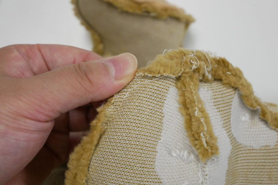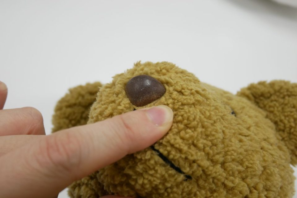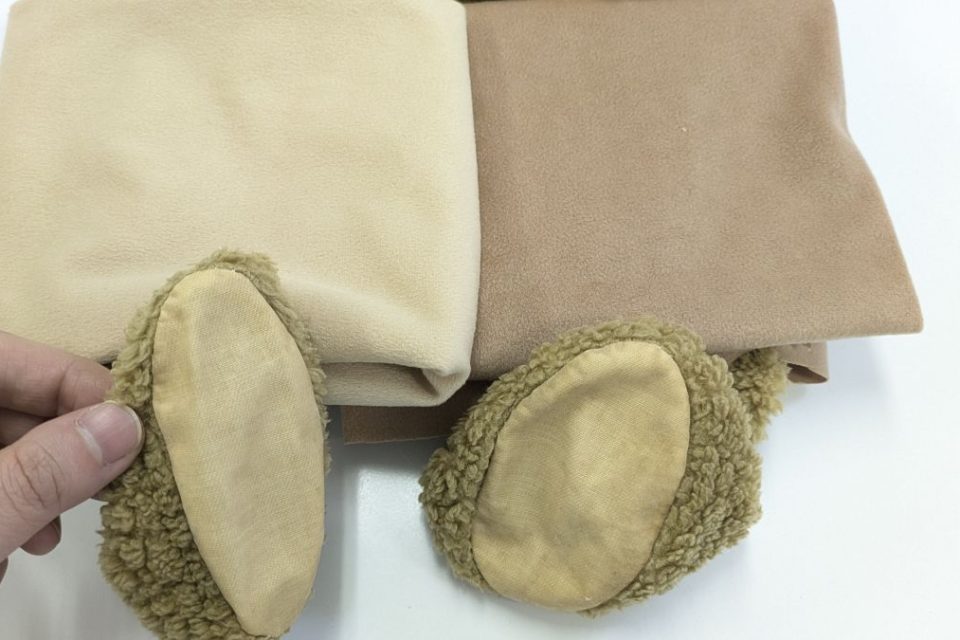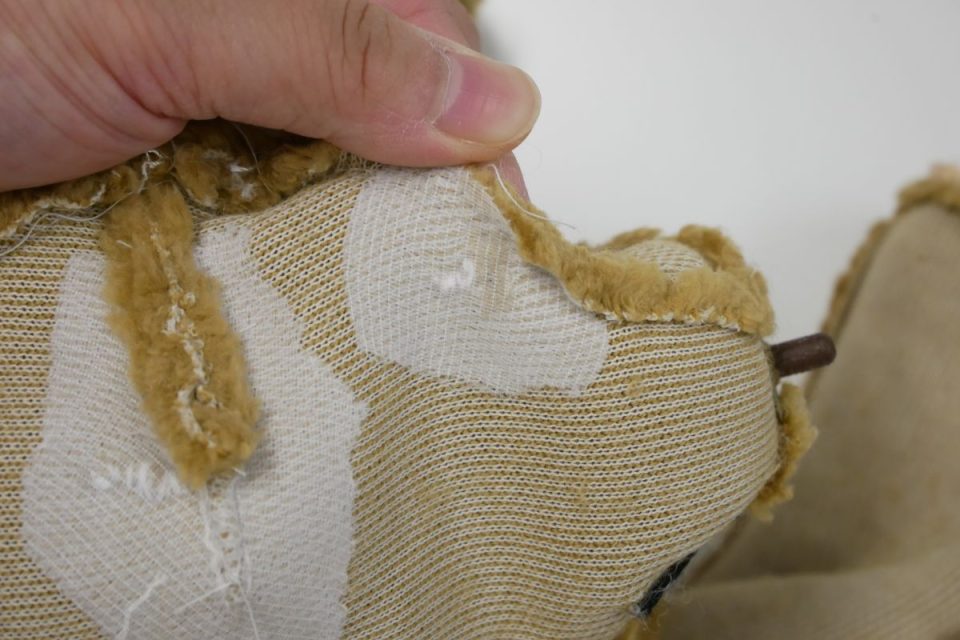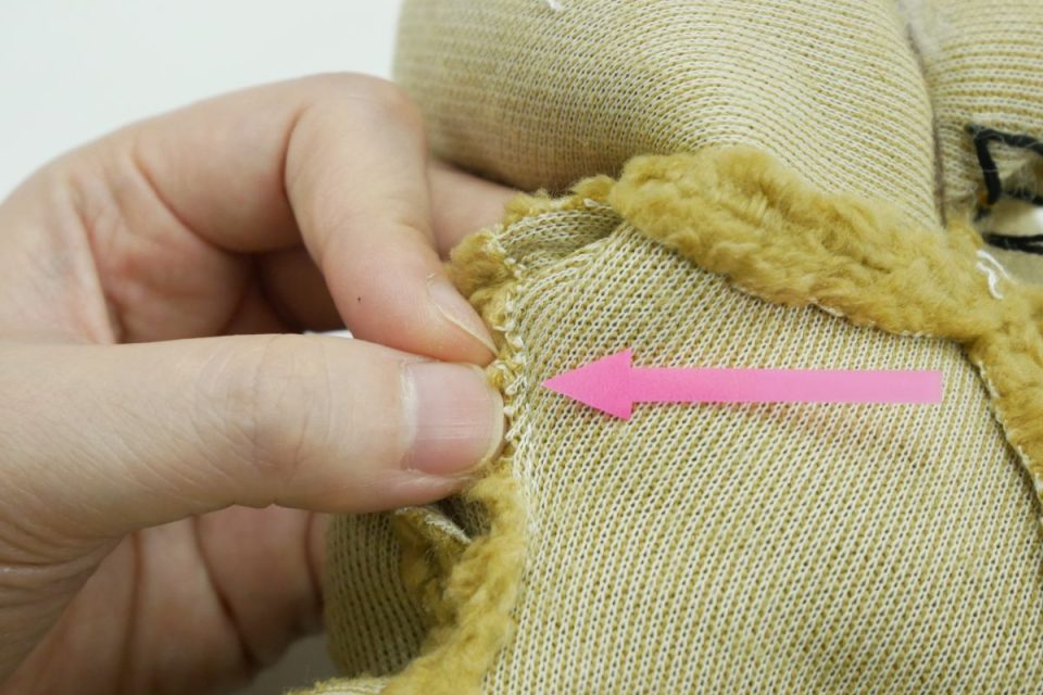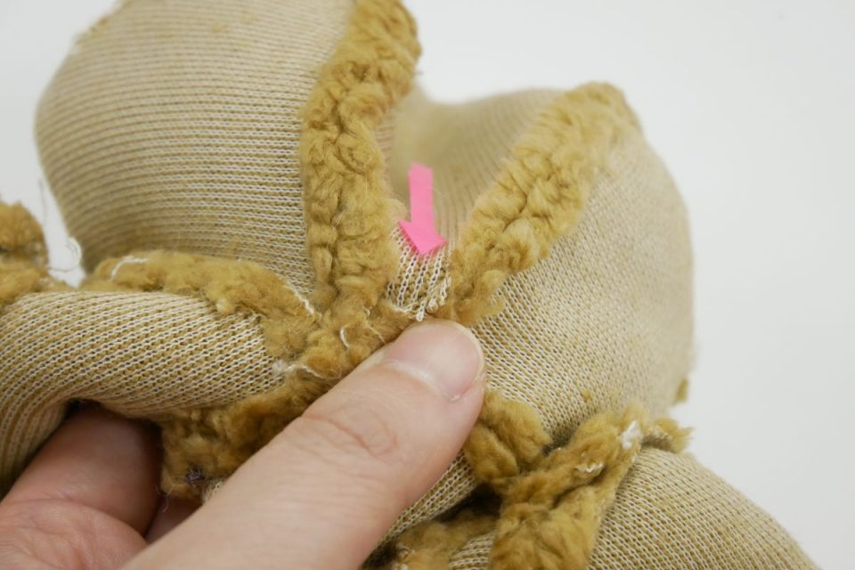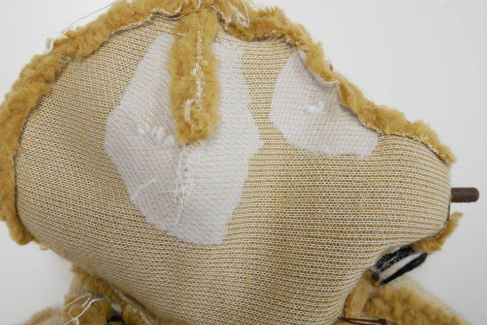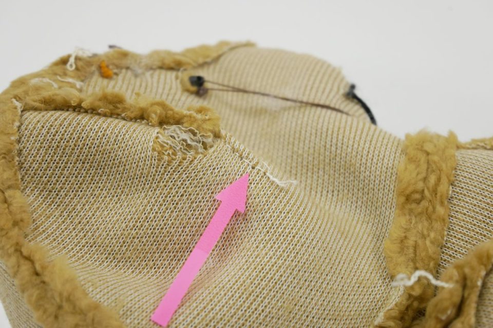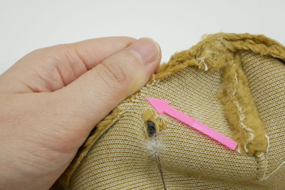 オミミの付け位置周辺・オメメ周りはチカラがかかりやすく、オケガも大きいためオケガ治療後に薄い芯をお貼りして生地の補強も行いましょう!