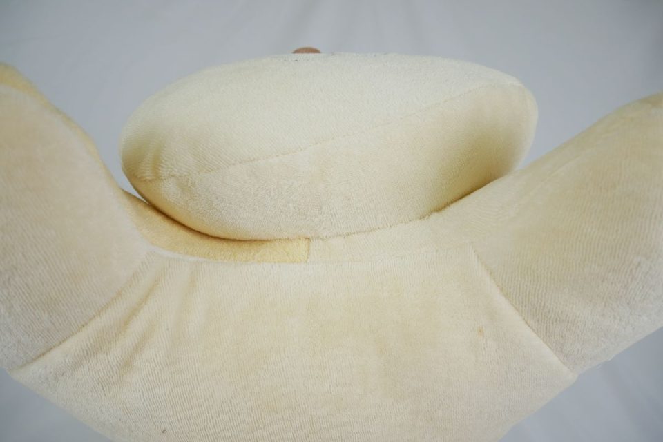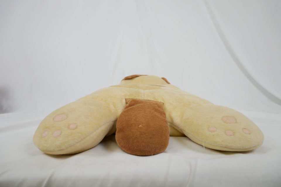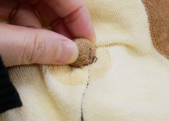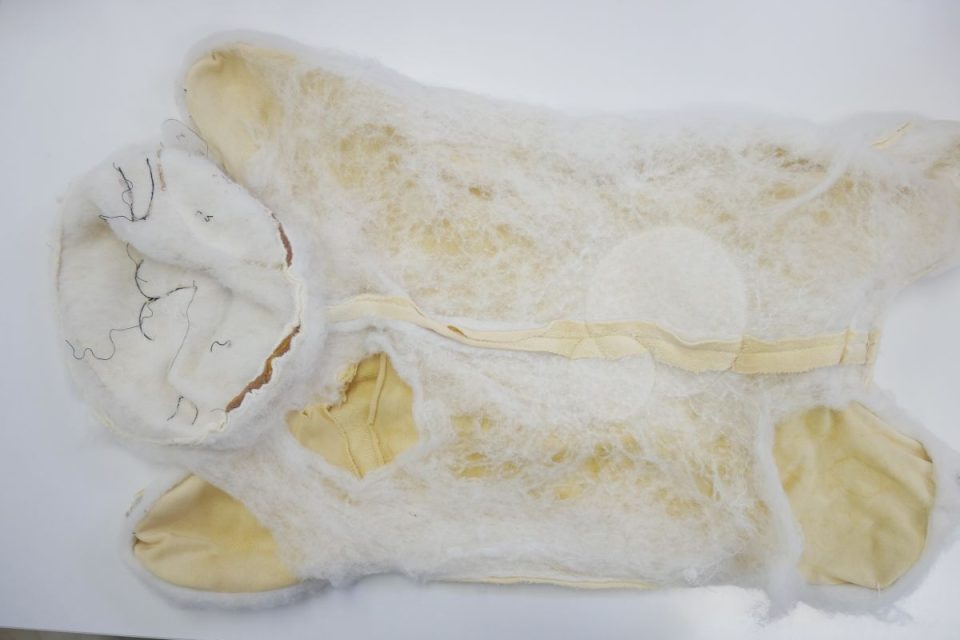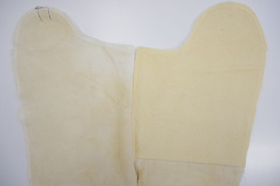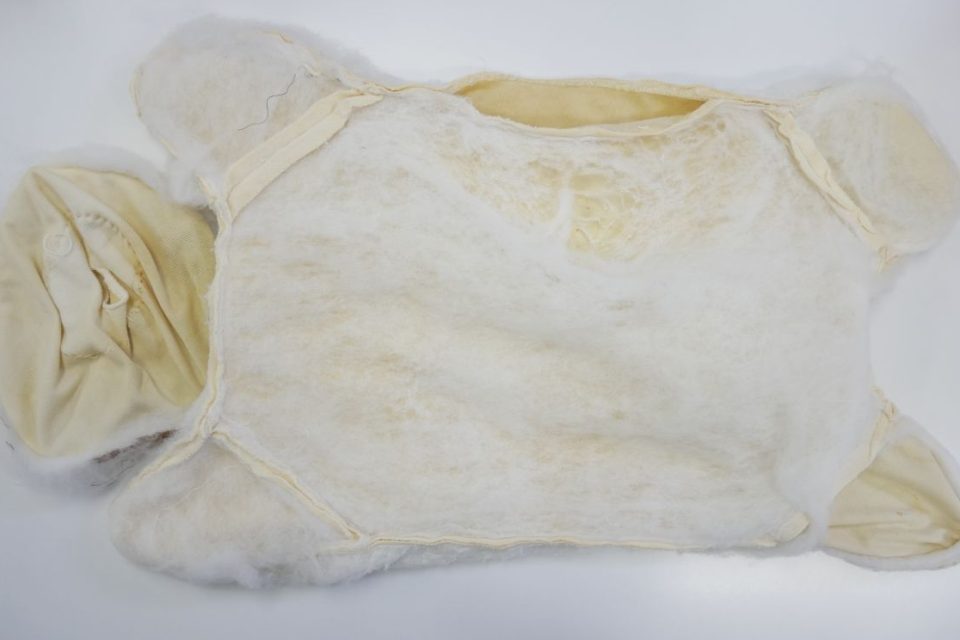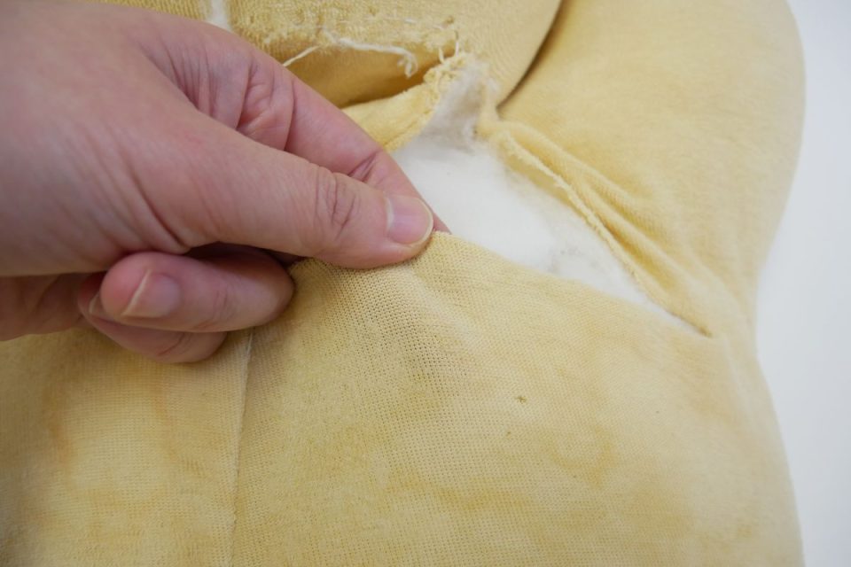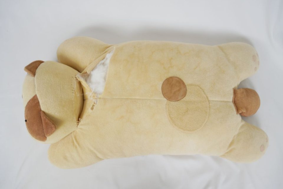 お顔と背中側は生地が薄くなり弱ってきていますので、オケガの治療を行った後は接着芯をはって生地の補強もおこないましょう。