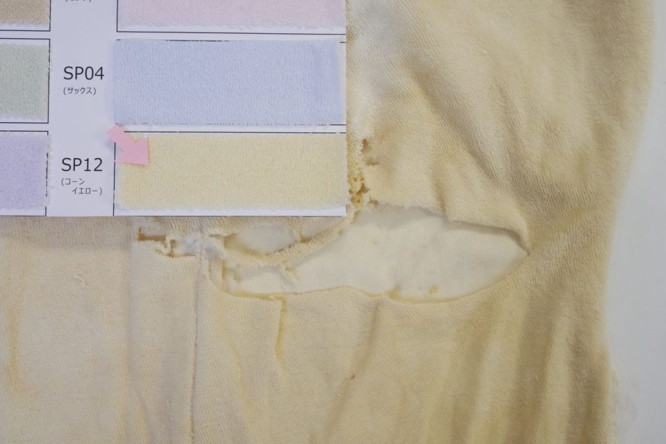 背中の生地あては、お見積り時にご案内した シンカーパイル生地のコーンイエロー が近い風合い・お色となりますがいかがでしょうか?