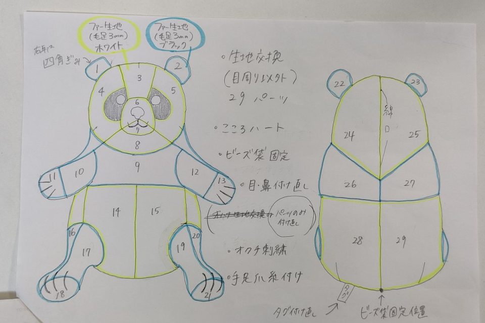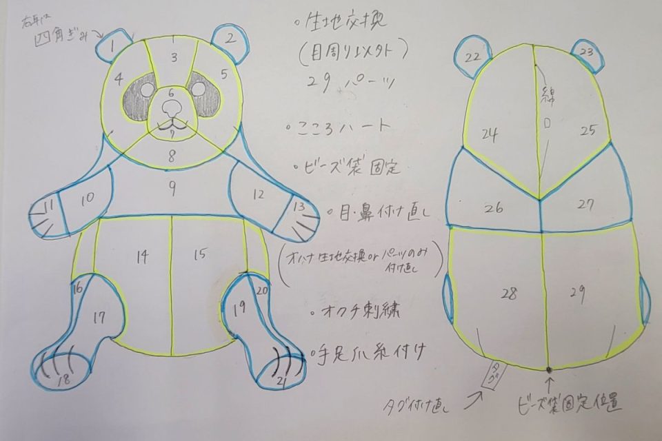 それでは、【②黒い部分は生地交換(オメメ周りは接着芯補強)+白い部分も生地交換(9.5~10万円くらい)】で進めてまいりますね。