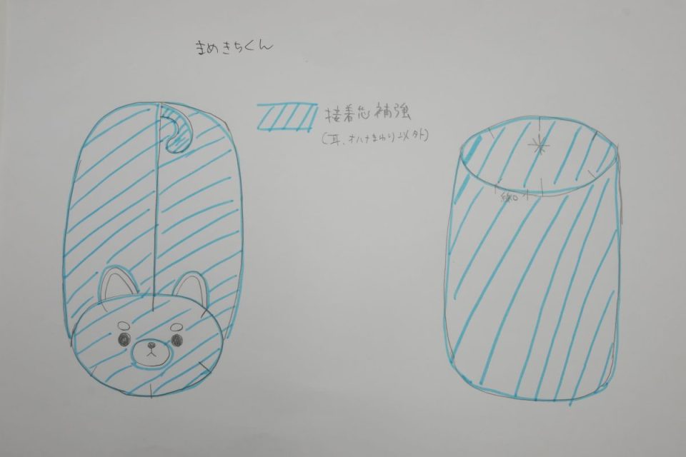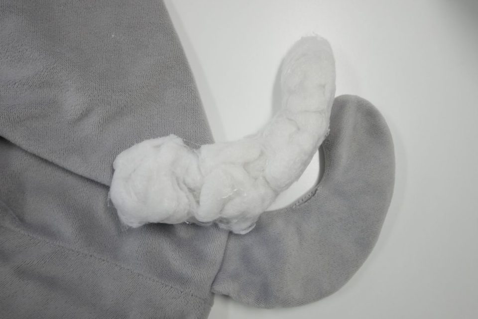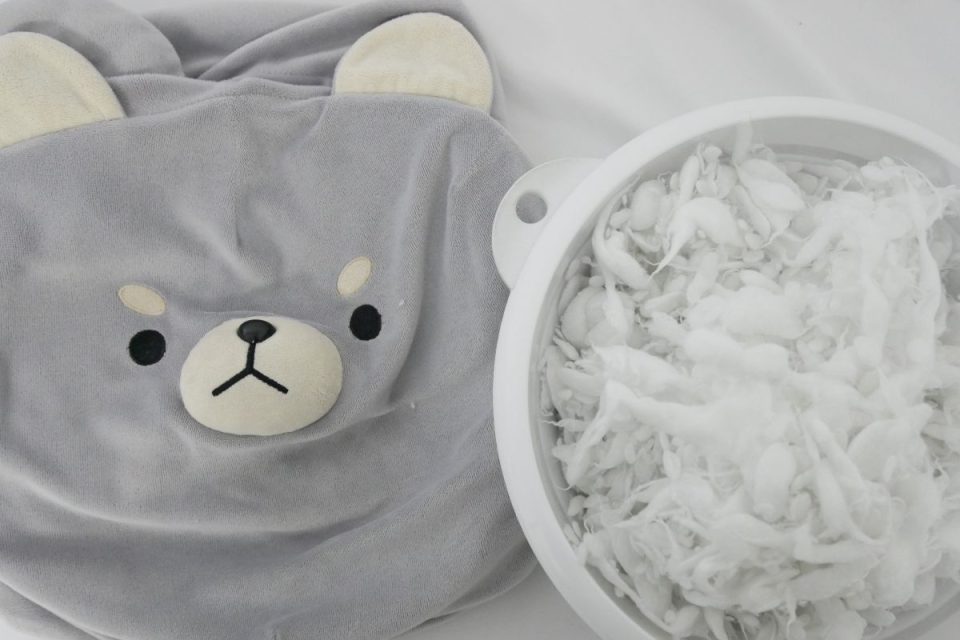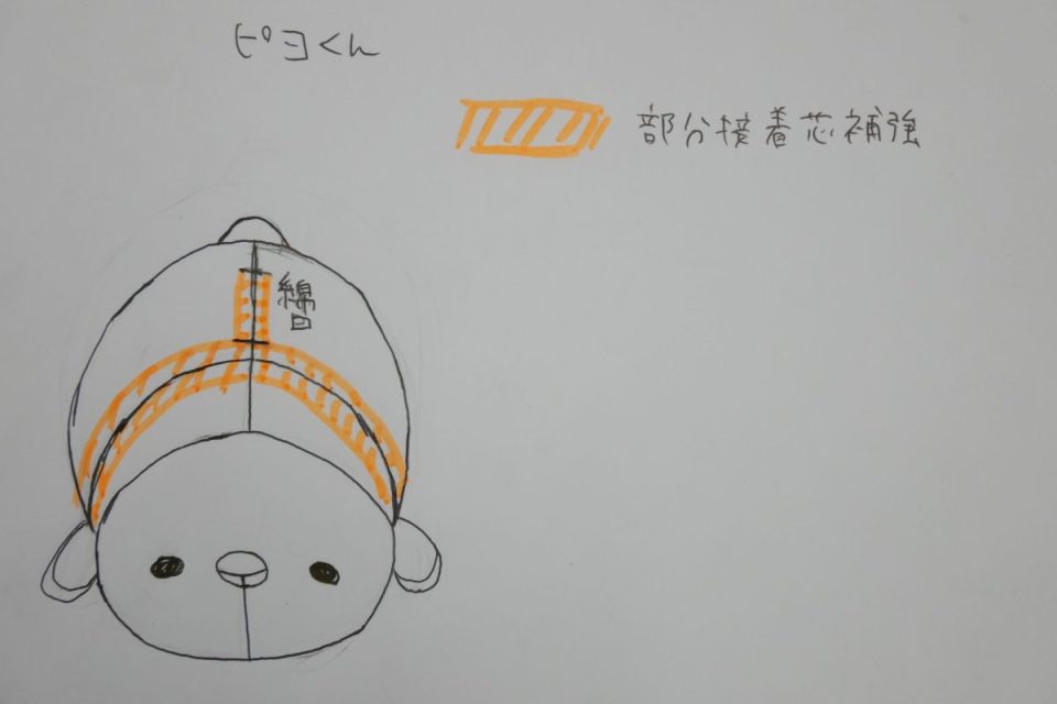 ボリュームが調節しやすいもちもちタイプのマシュマロ手芸綿(100gあたり550円)を使用することで生地に負担を減らし、綿口など負担がかかりやすいところを部分的に補強します。