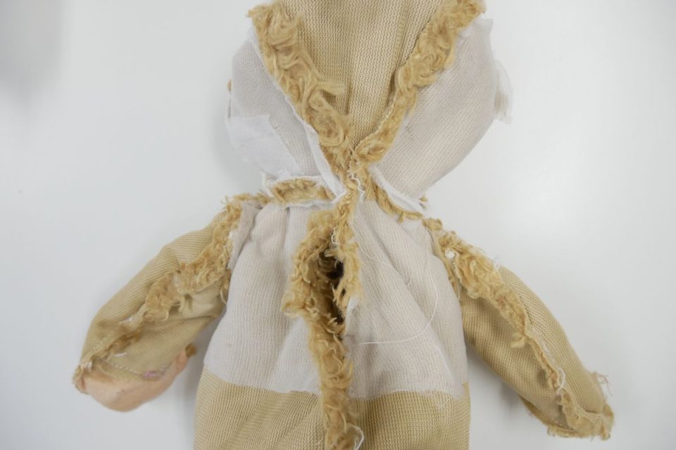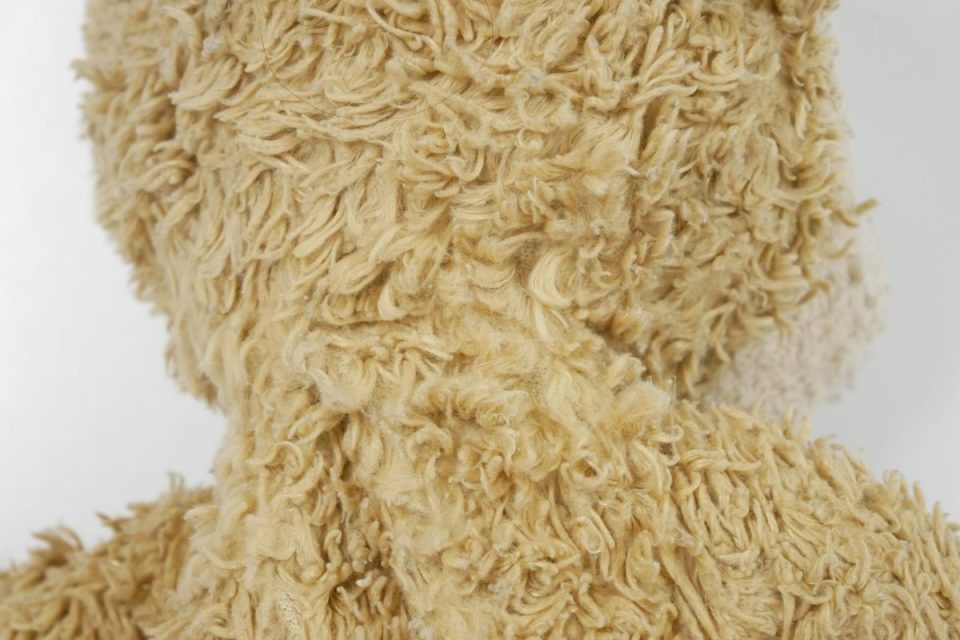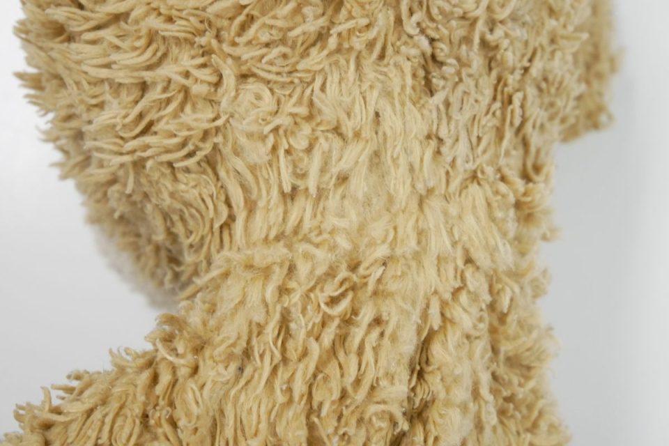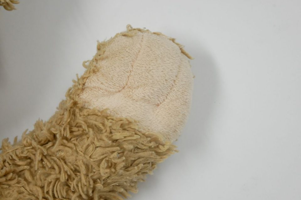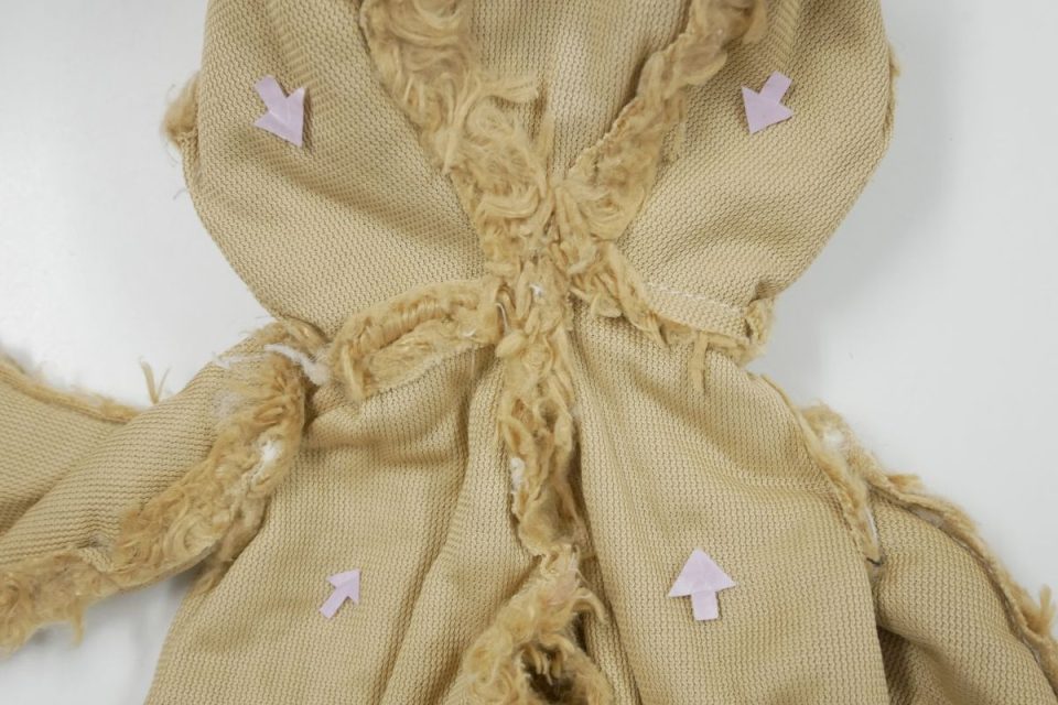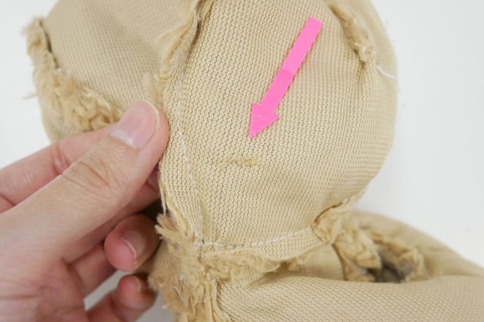 首の後ろ部分は弱ってオハゲになっていますので、裏側から接着芯をお貼りして補強してまいります♪