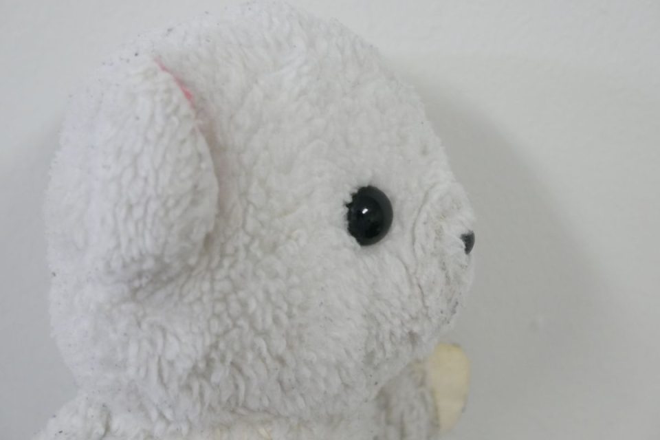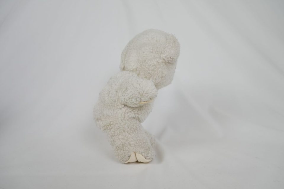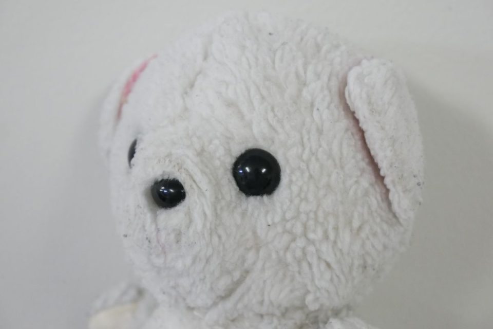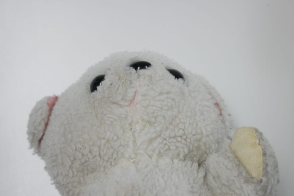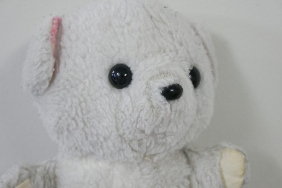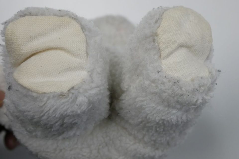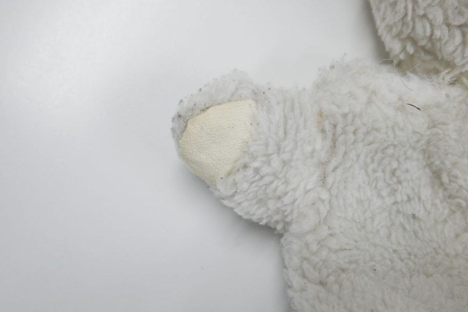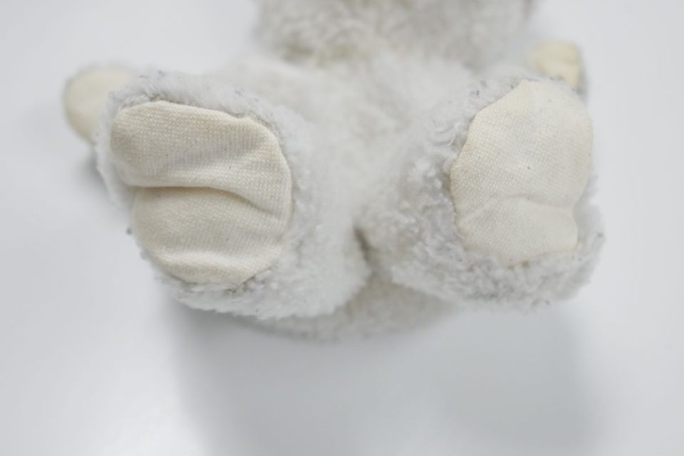 ホワイティーの手足先は、元々は耳と同じピンク色の生地だったのですが、擦れて破れてしまったので10年ほど前に自分でキャンバス地を使って修復したんです。
