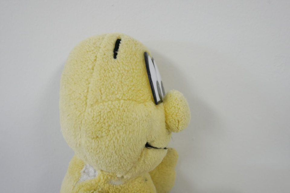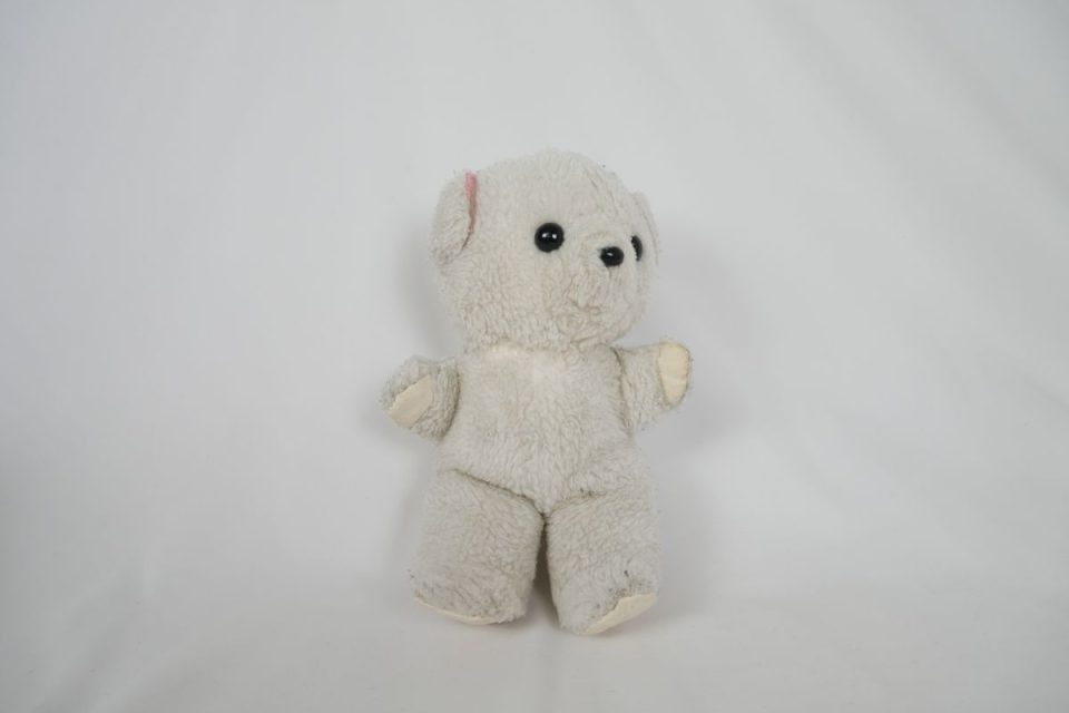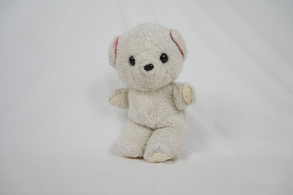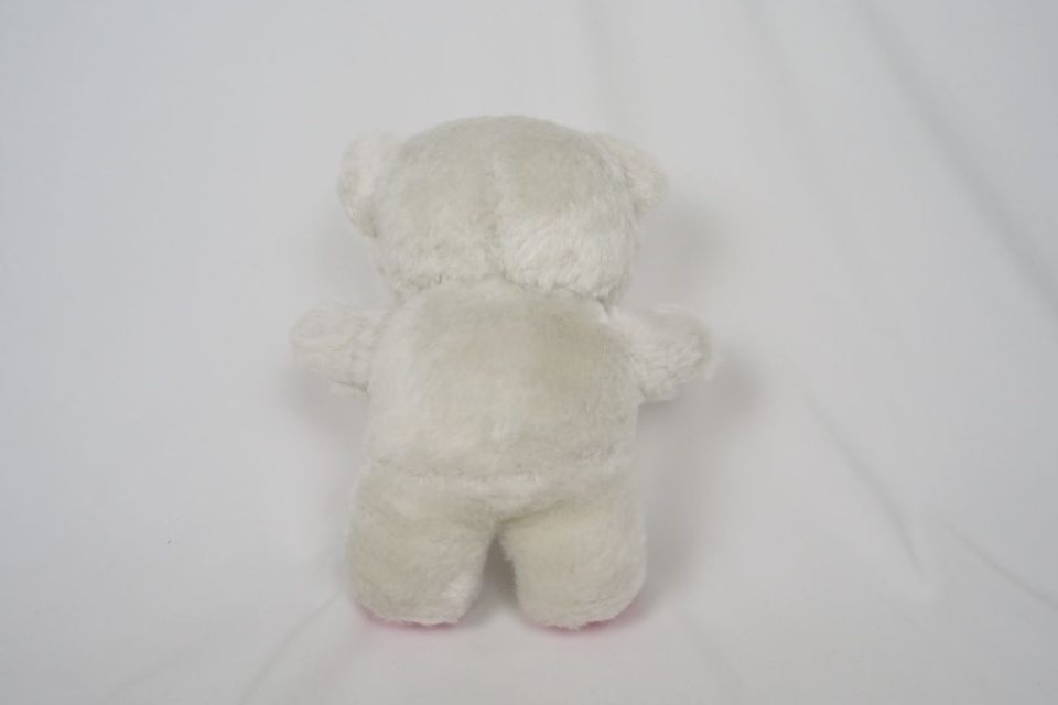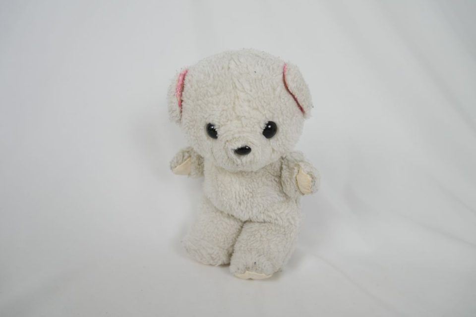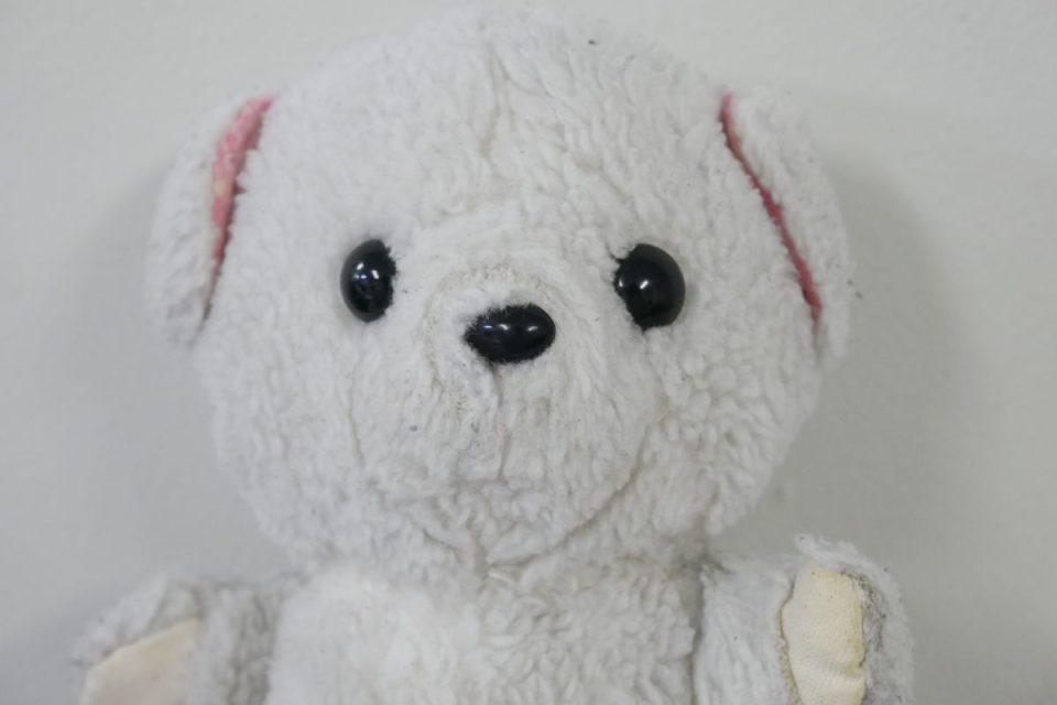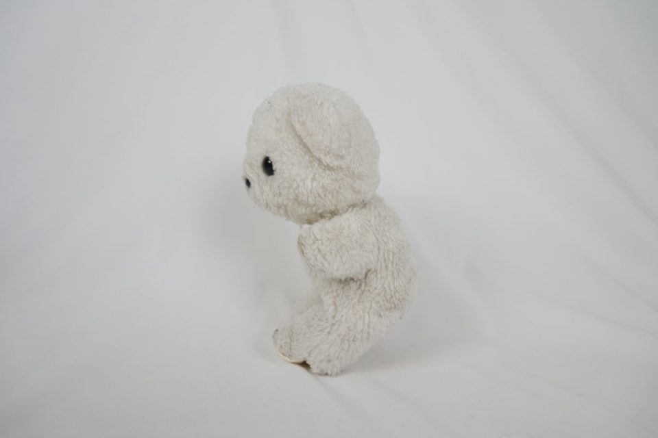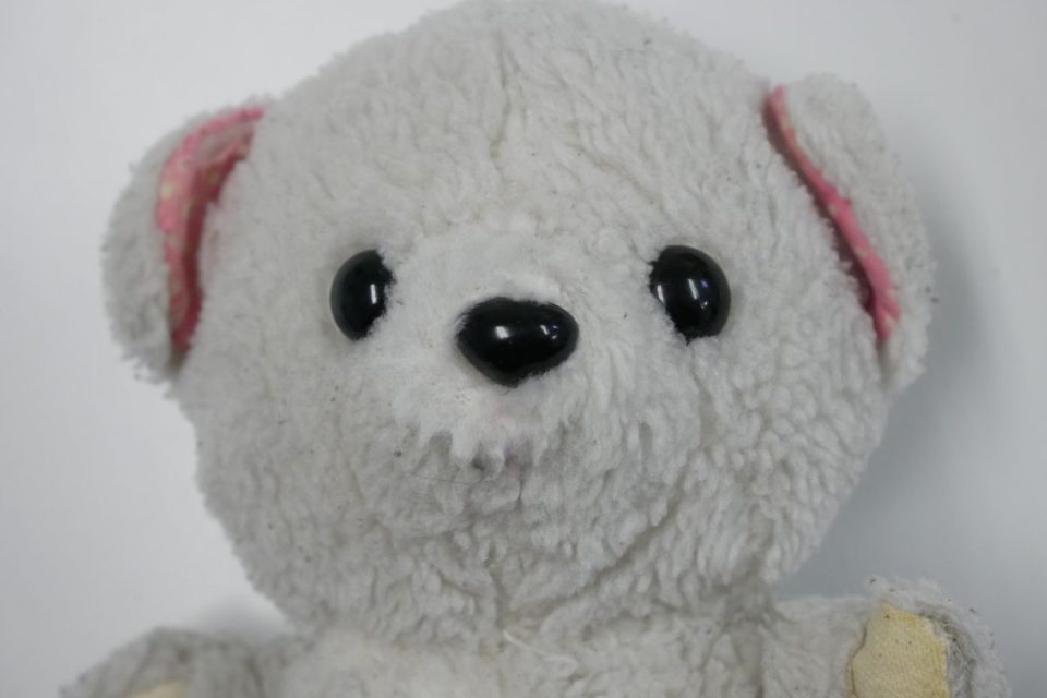 ホワイティーの手足先は、元々は耳と同じピンク色の生地だったのですが、擦れて破れてしまったので10年ほど前に自分でキャンバス地を使って修復したんです。