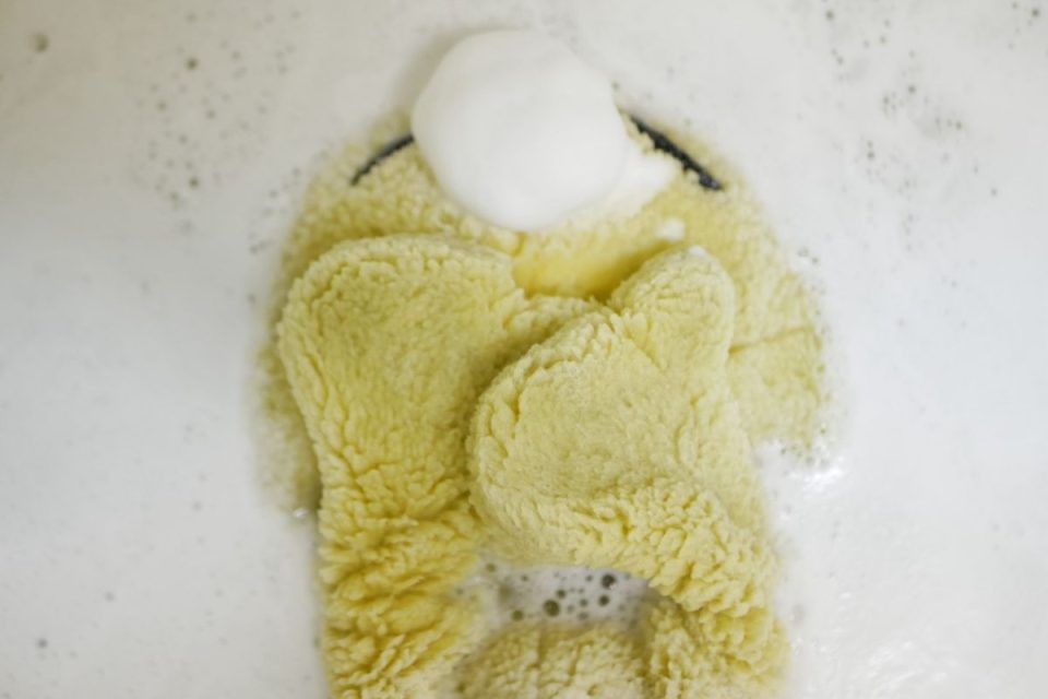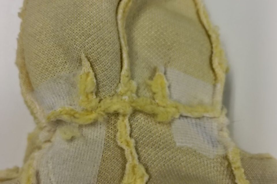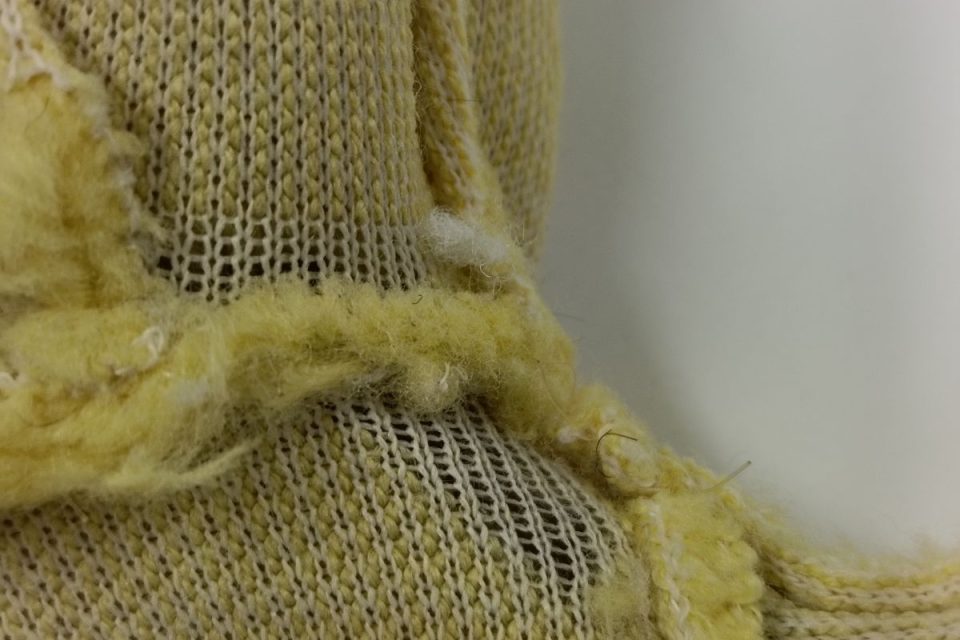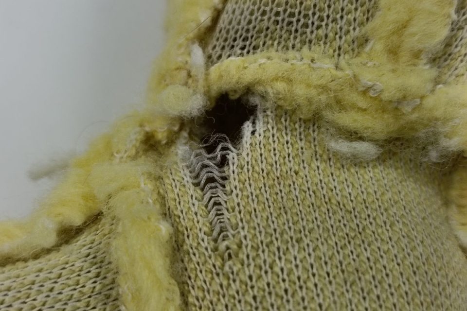 首まわりは生地が弱りオハゲになっているため、裏側から接着芯をお貼りして補強します。
