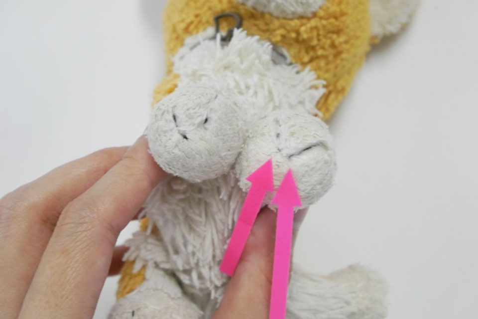 ヨチュくんのオクチ周りの染み抜き、オハナとオクチの付け直しが完了いたしました。