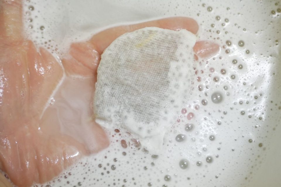 元々の綿を一部クリーニングしてピンクのハートのガーゼにお入れし、綿入れ時にお戻ししましょうね(*'ω'*)