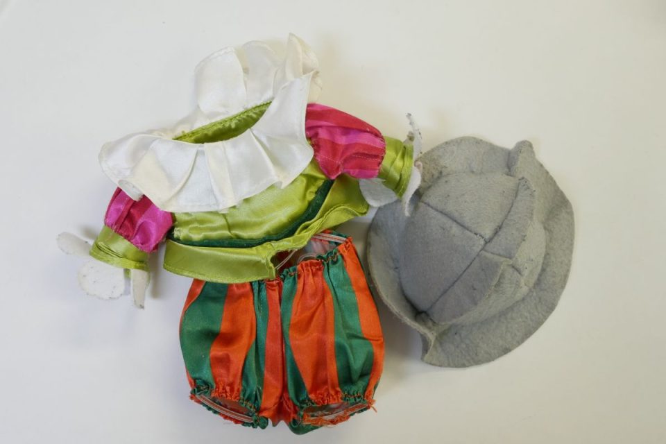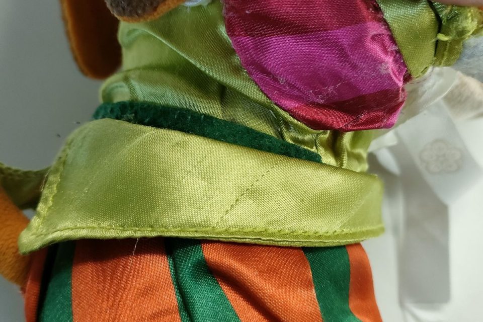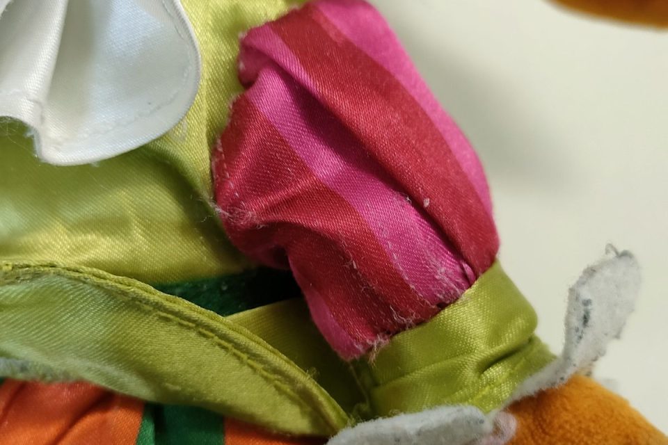 お洋服はほぼサテン素材で作られており、すでに一部に糸引きが見られる状態です。