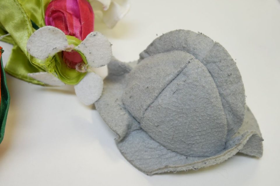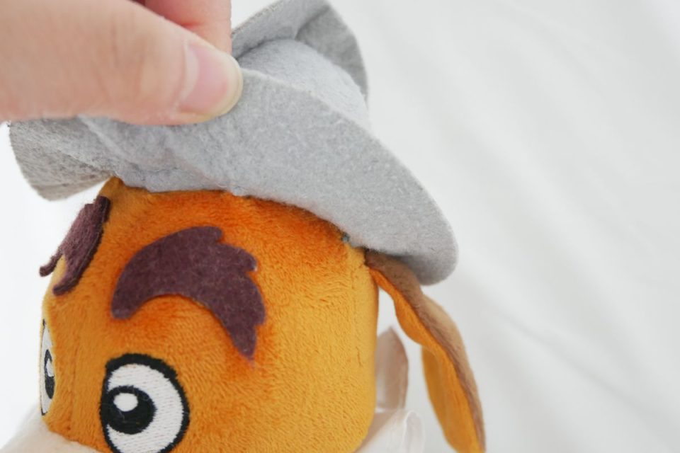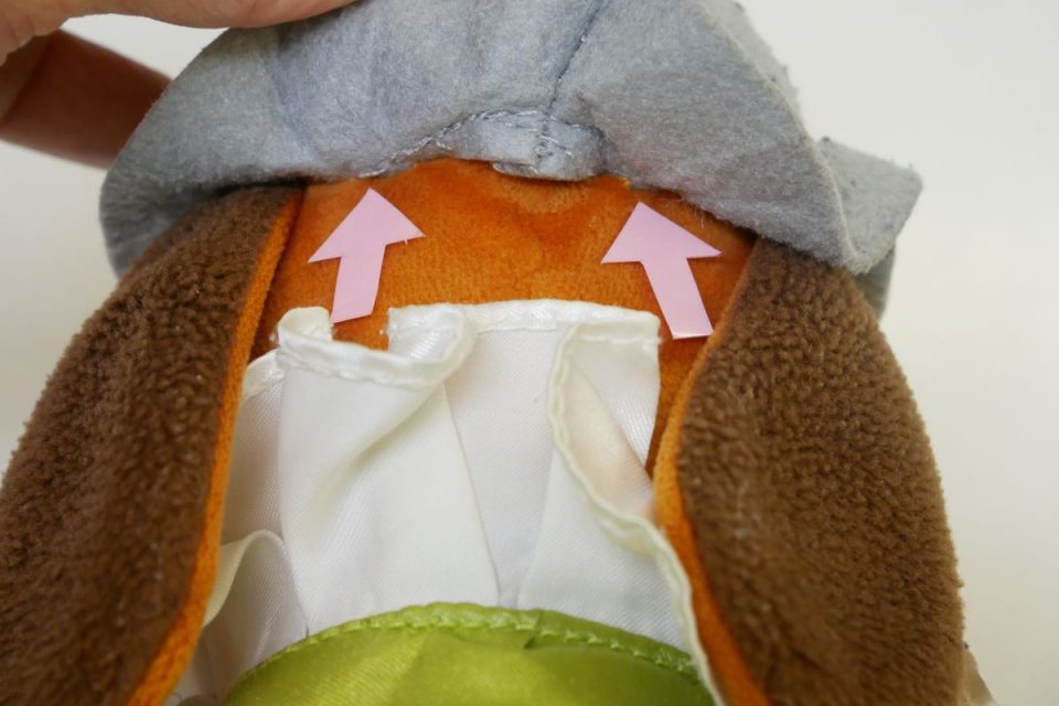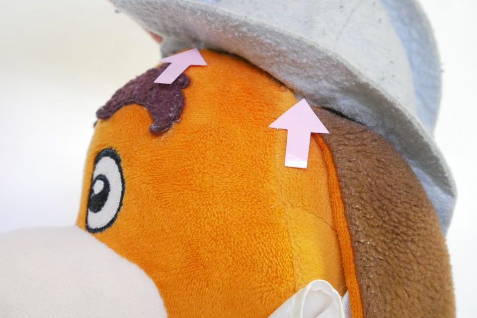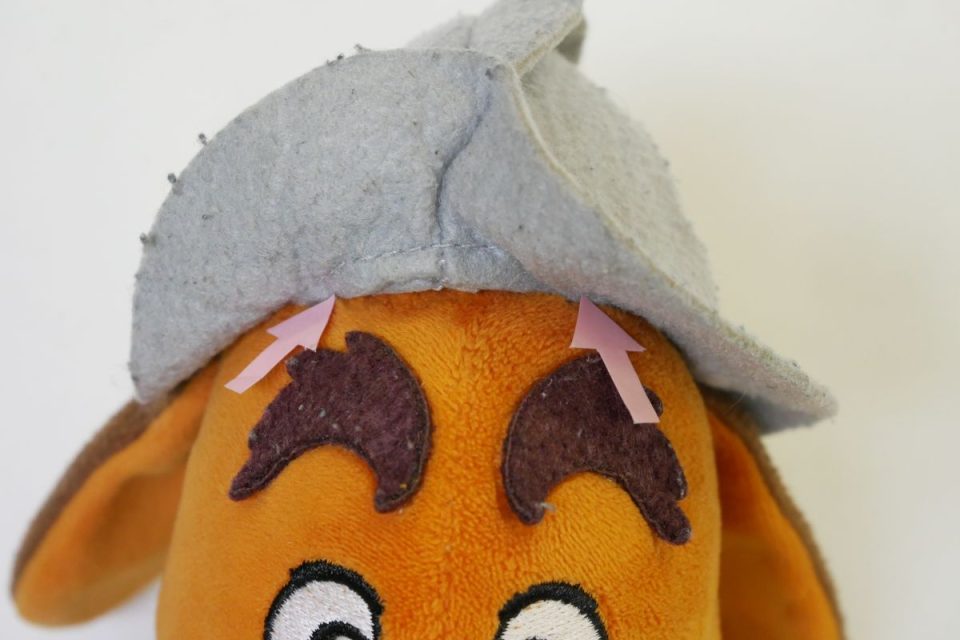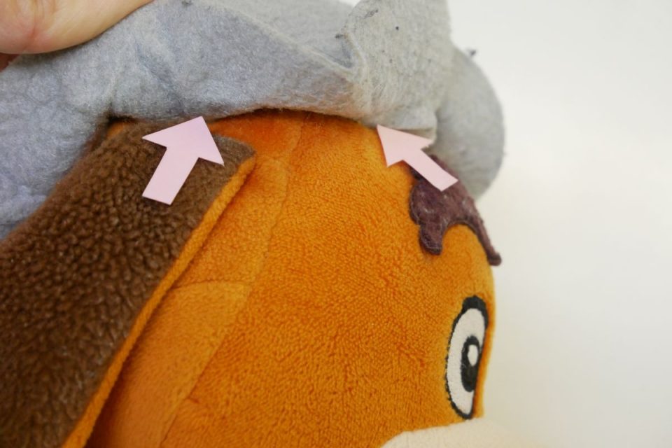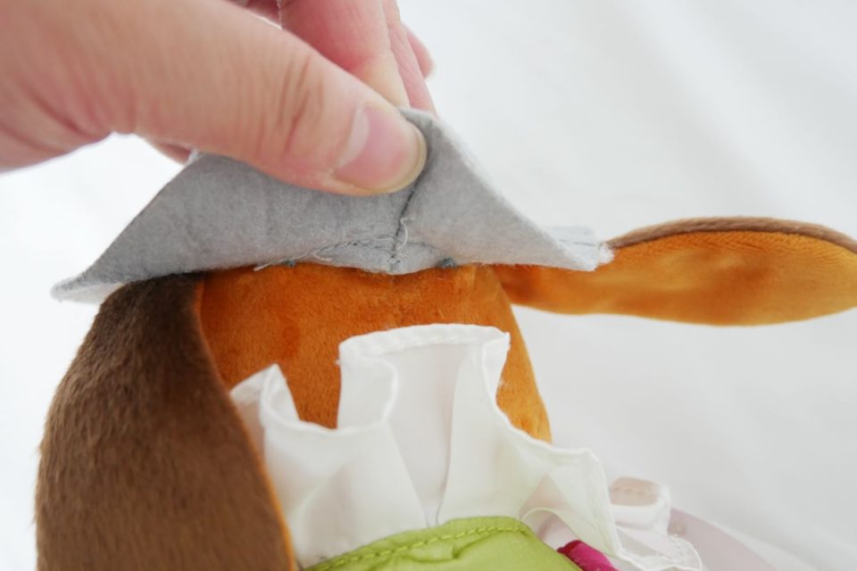 帽子は頭に6箇所縫い留められていましたので、同じように付け直しいたしますね。