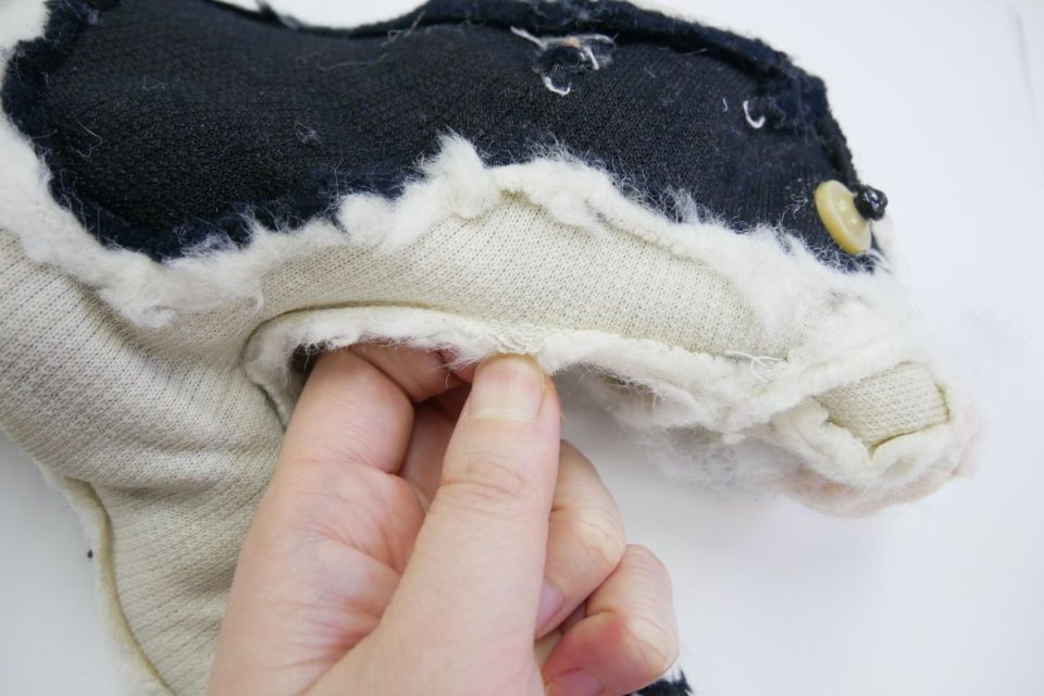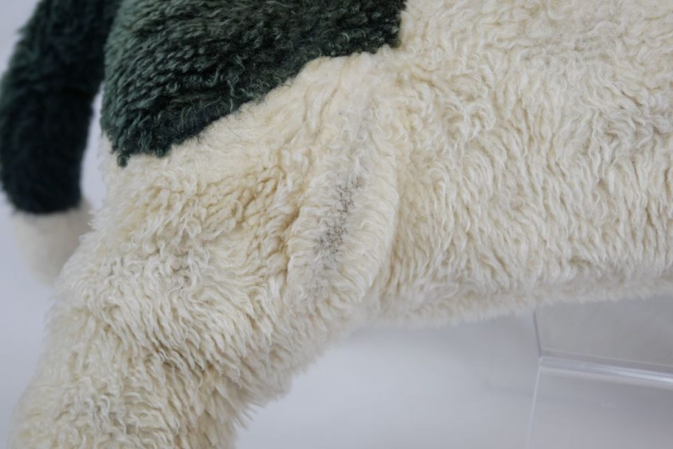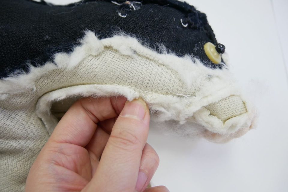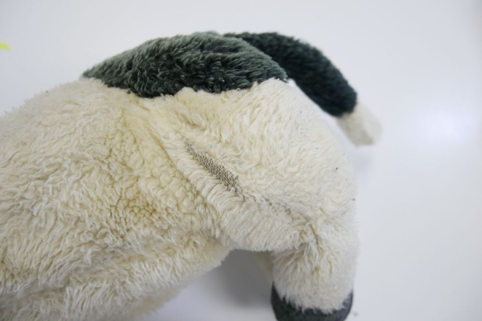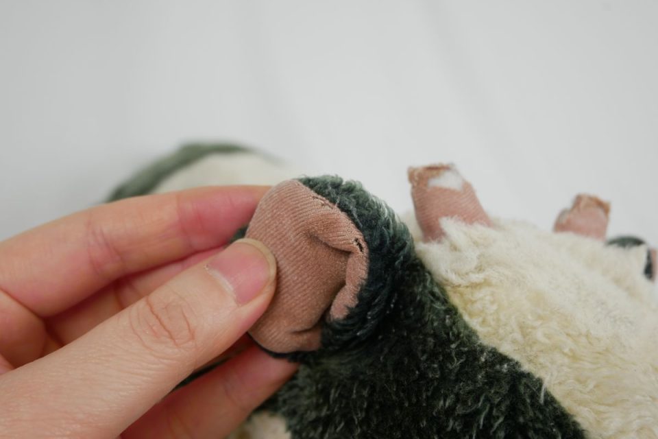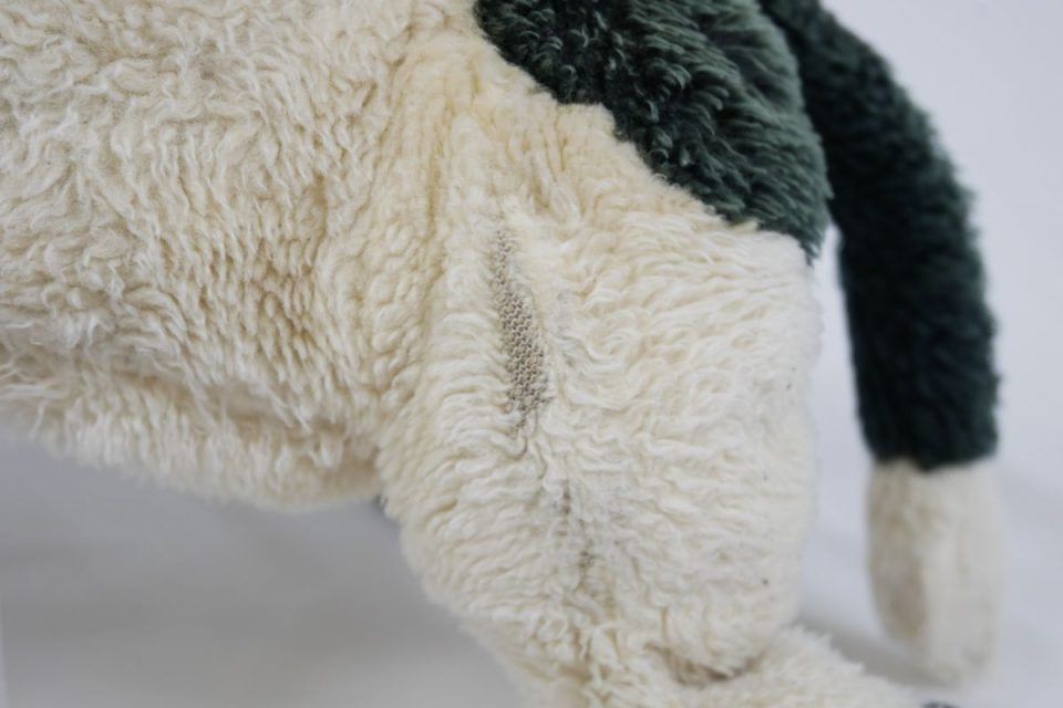 ウッシーくんは所々土台の生地がゆるみ毛が抜けてオハゲになっている箇所がございましたので、部分的な補強の治療をお見積もりに入れさせていただきました。