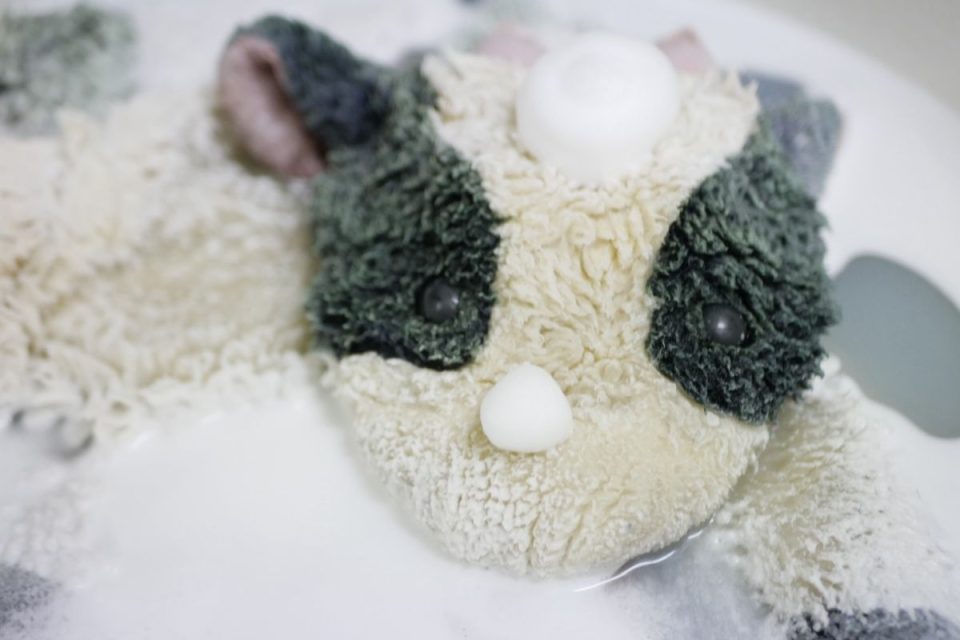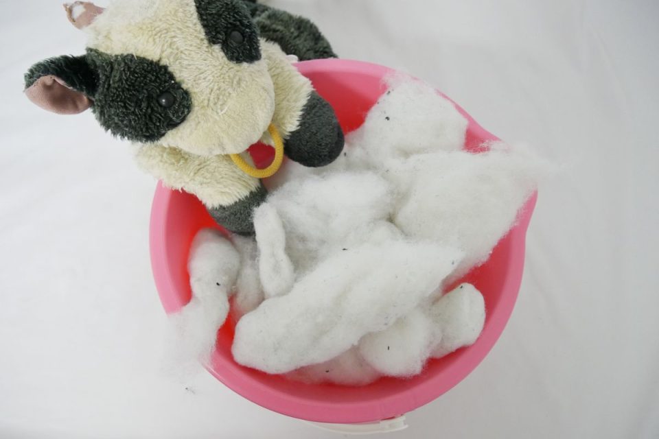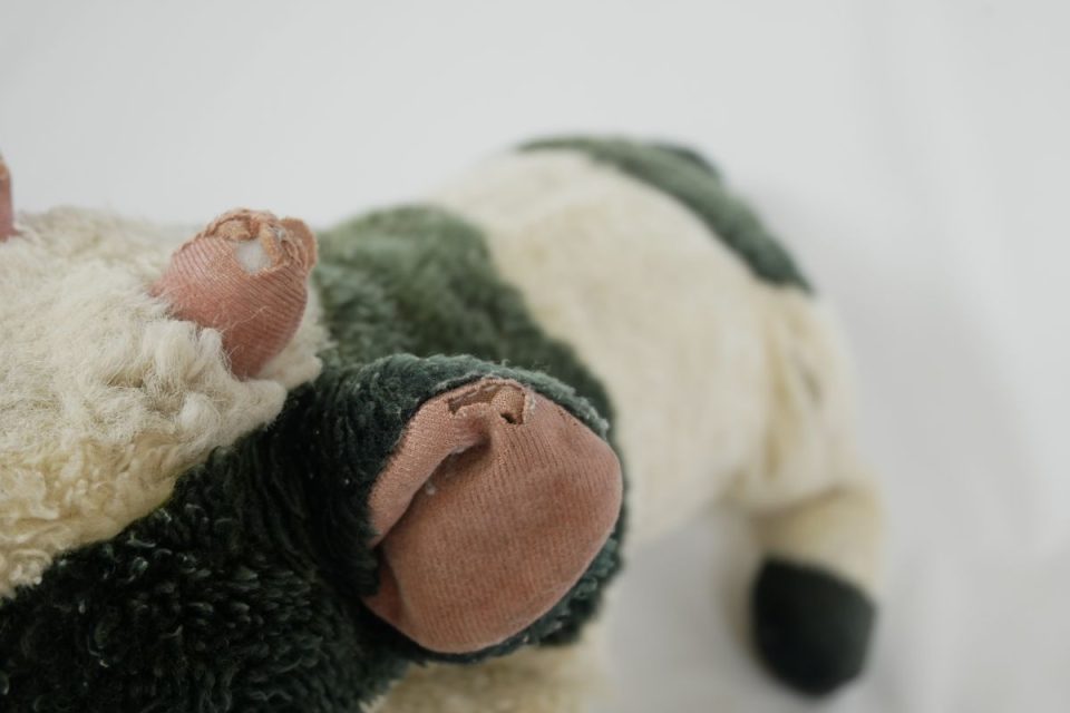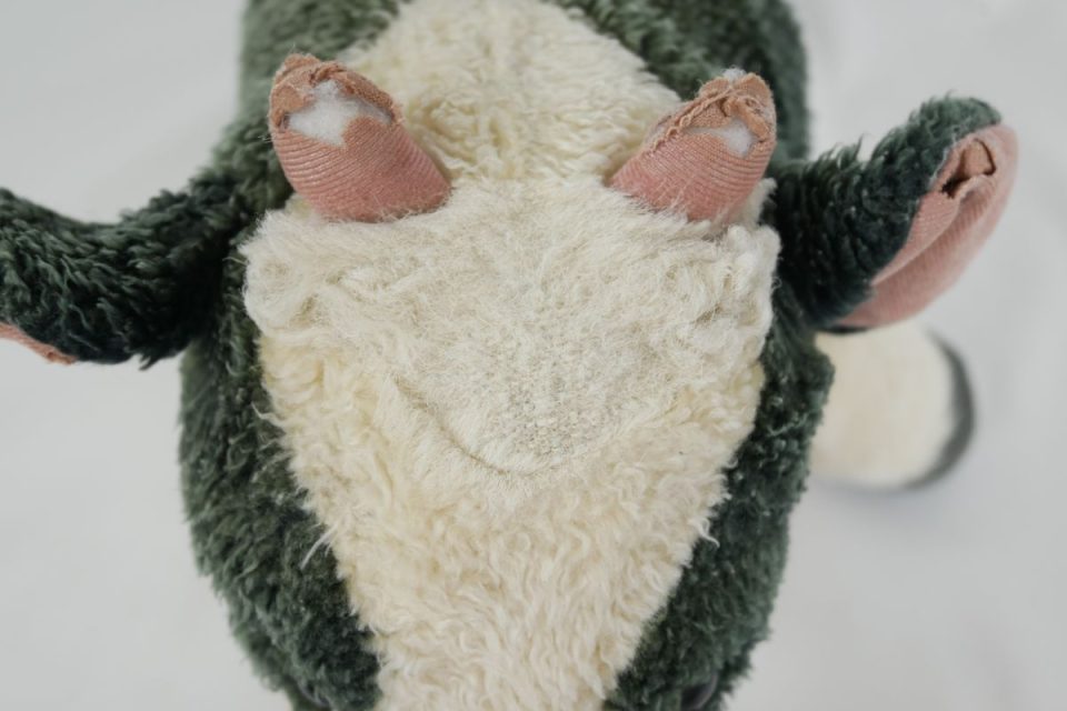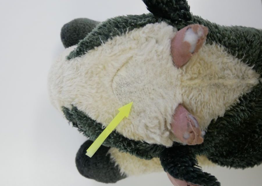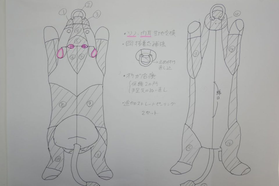 ウッシーくんは所々土台の生地がゆるみ毛が抜けてオハゲになっている箇所がございましたので、部分的な補強の治療をお見積もりに入れさせていただきました。