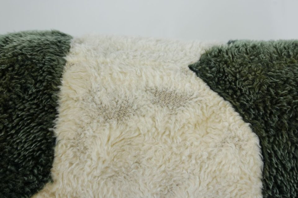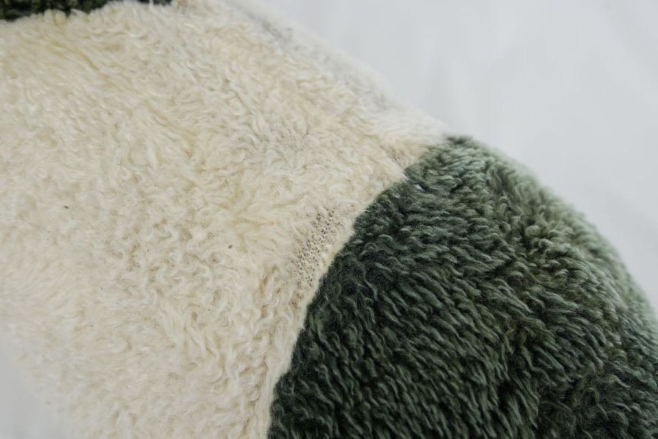 お見積時にお伝えしました通り、毛が抜けて土台がゆるくなってきている部分(図の斜線部分)は裏側から芯を貼って生地の補強をおこないます(^^)」