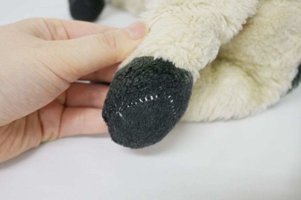くるりんぱで検査したところ、生地の端が切れている箇所2箇所と、手足先の縫い線のゆるみがありましたので、タイムチャージ1時間で全て治療していきます。