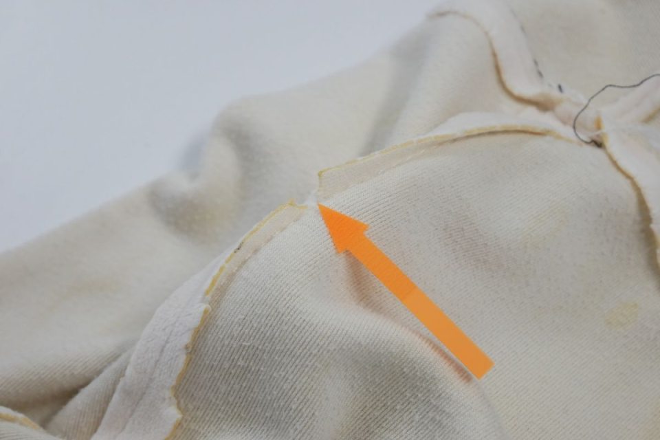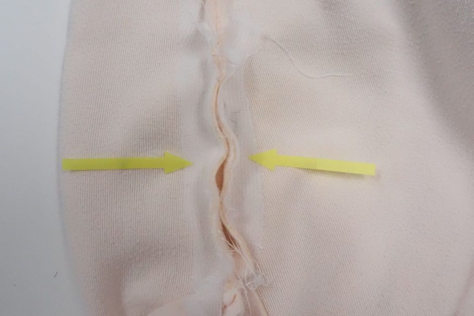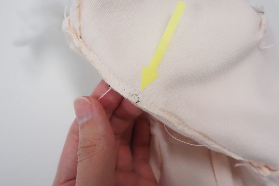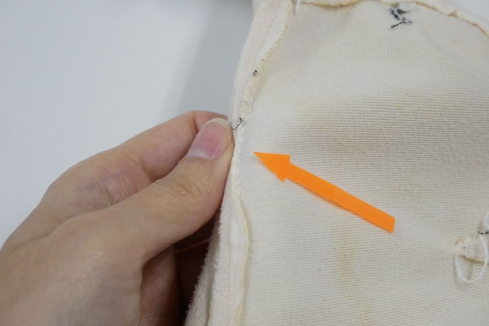 縫い代がギリギリで縫われているところはそのままにしているとホツレてしまう危険性がございますので、縫い代をしっかりとって縫い直します。