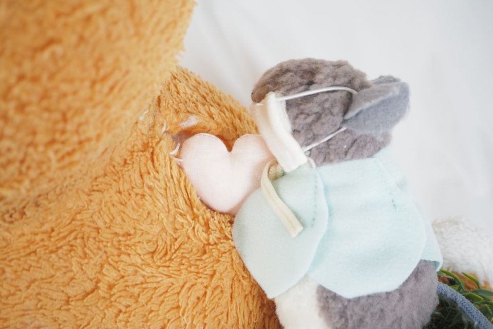元々の綿を一部クリーニングしてピンクのハートのガーゼにお入れし、綿入れ時にお戻ししましょうね(*'ω'*)