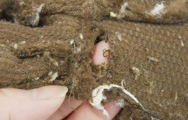 また、オケガ付近と毛が擦れてうすくなっている箇所は、裏側から接着芯をお貼りして部分的に補強をしてまいります。