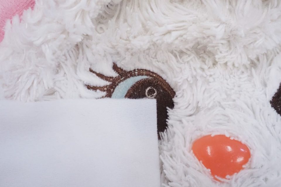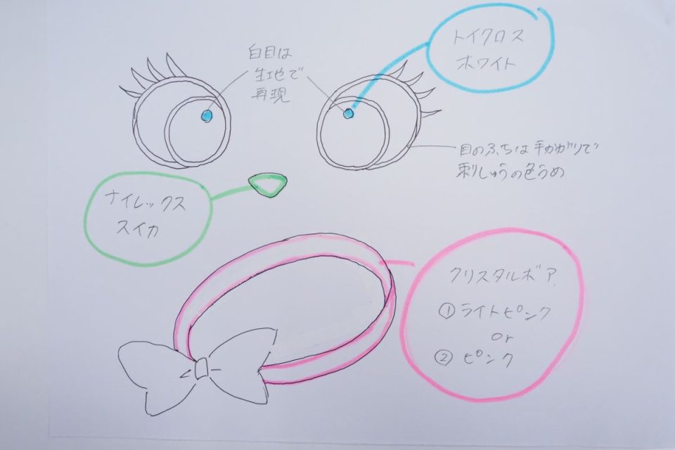 オメメの治療は、外れてしまった機械刺繍部分を手刺しゅうで付け直す方法でお見積りさせていただきました。