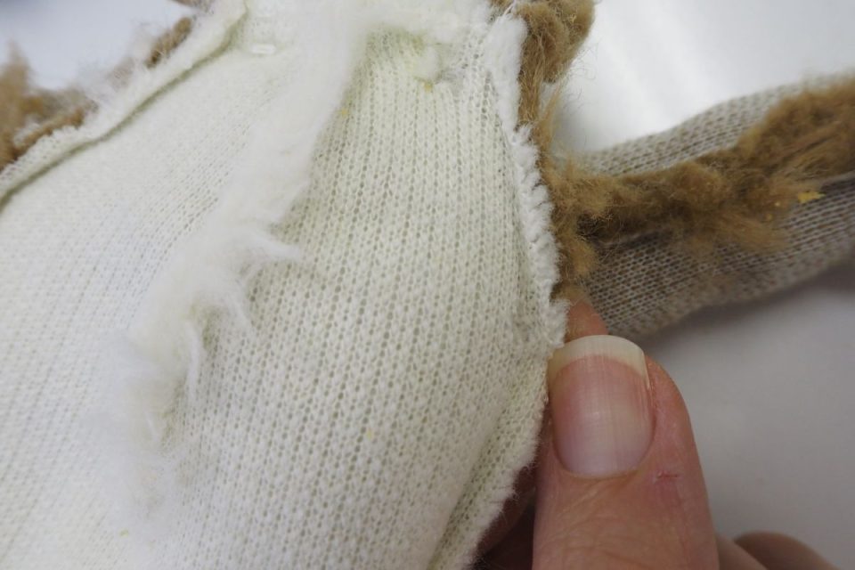 中綿の再利用をご希望でしたが、ウレタン綿はお体の生地を傷める原因となりますので白いポリエステル綿に交換しましょう!
