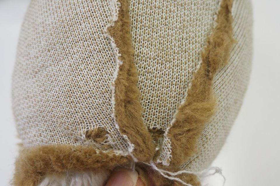 右目周りの毛が薄くなっている箇所には裏側に接着芯補強をしていきます。