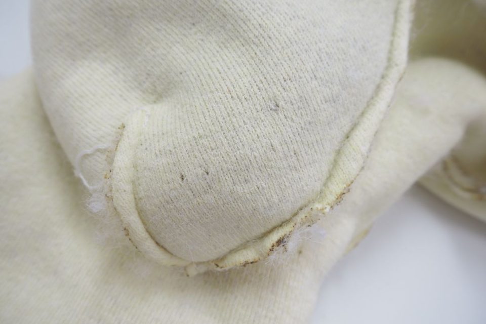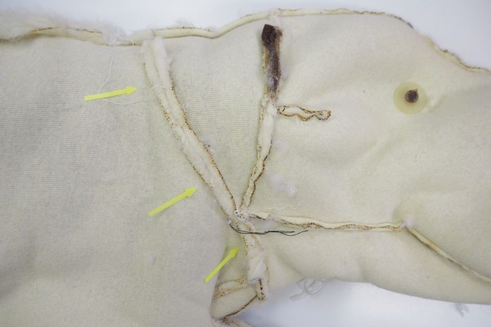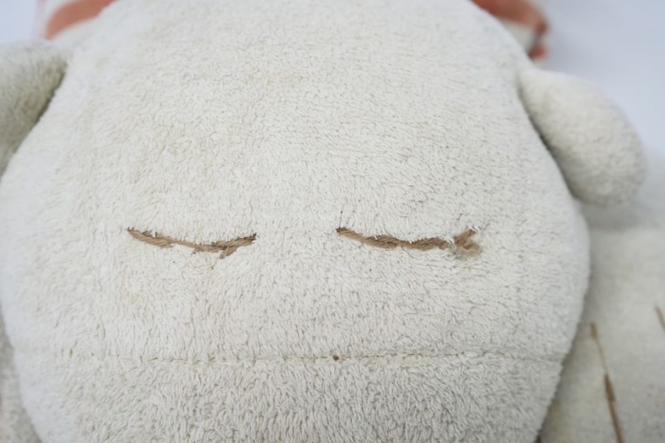 オメメの糸は中綿をそれほどかんで付けられていませんので、そのままとさせていただきますが、糸がすこし弱ってきていますので外れないように裏側から接着芯をお貼りして補強を行いました!