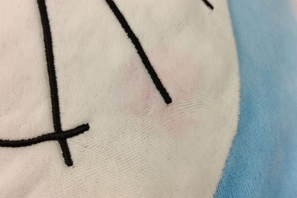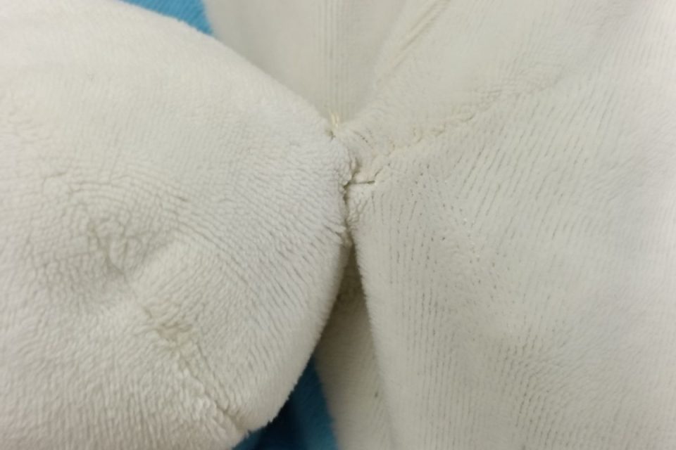 どっちゃんは伸びやすい生地で作られており、すでに全体的に生地が伸び、中の綿も凸凹した状態になっております(>_<)